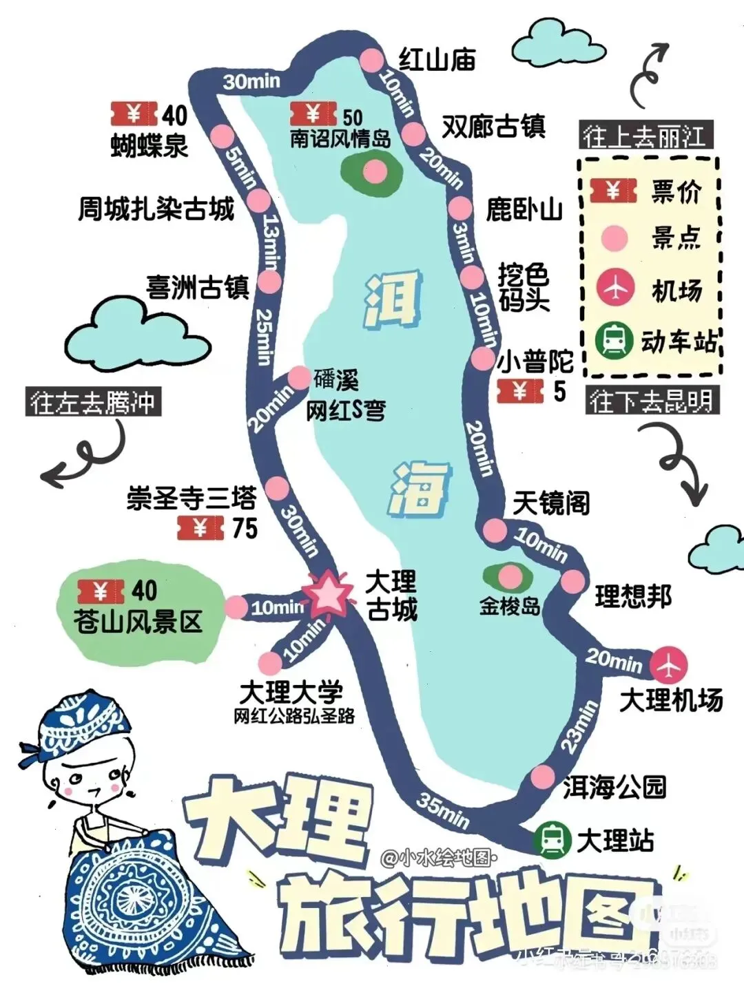 这个主要是为了住宿攻略打基础,我当时就遇到一个姐妹,她也是自己一个人来大理玩,我们有次一起约着去洱海的对面玩,然后她说想去理想邦,就是大理“圣托里尼”那片热门景点,我把地图拿出来给她看,非常远,如果你想要去这里玩的话,最好尽量住在那附近