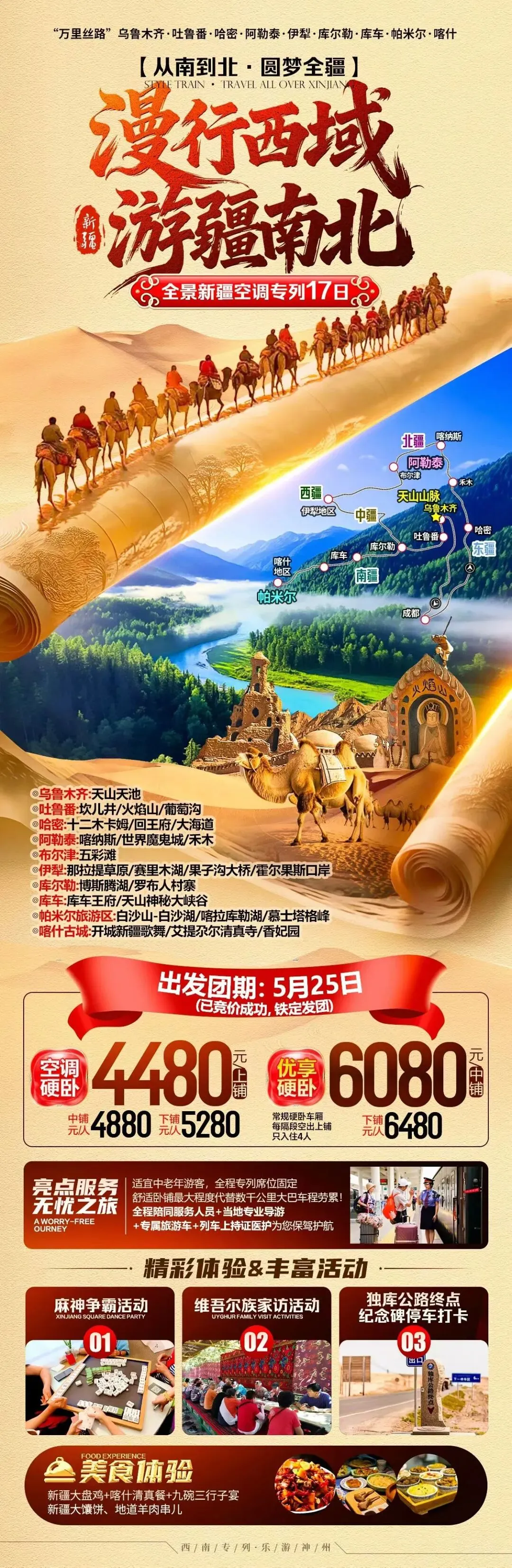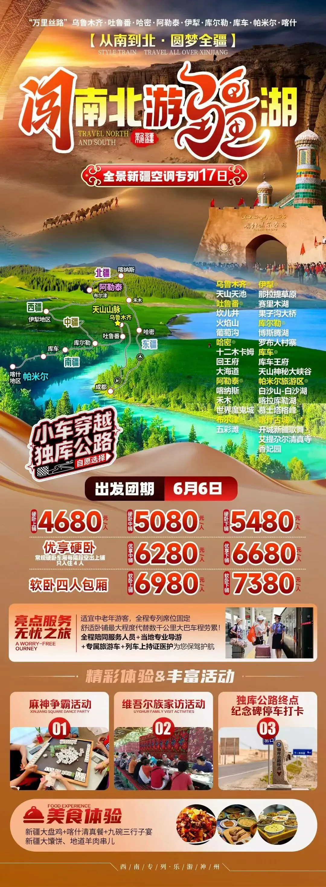 别人去新疆,要辗转各地赶车赶路,而坐新疆旅游专列,白天沉浸式打卡,夜晚专列安心赶路,解锁新疆的打开方式直接升级!从南到北用17天穿越大美新疆:雪山、湖泊、草原、花海、戈壁、古城...别再纠结去南疆还是北疆,这一趟全含,全程还有医护,领队导游成都绵阳上车,边坐边看风景,不累不赶自由休息。