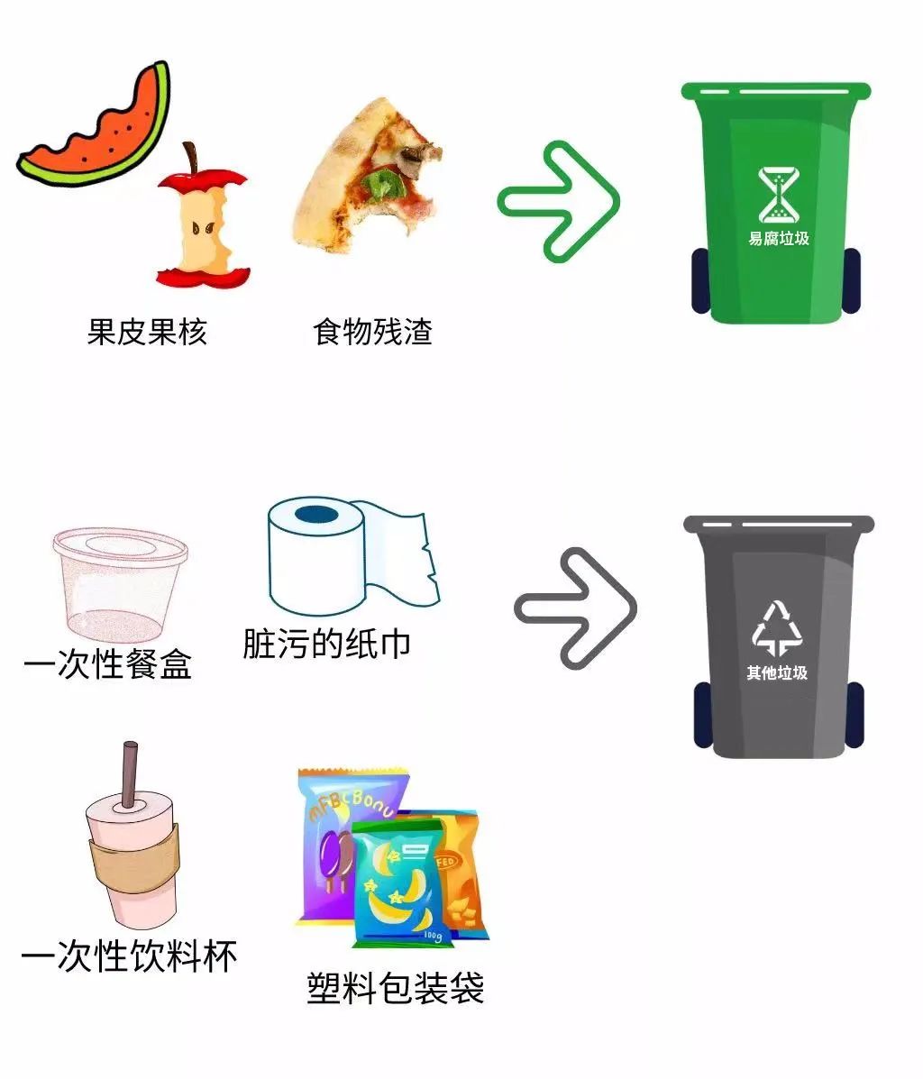 野餐后的垃圾要注意用不同的垃圾袋分类装好哦。吃完的果皮果核、食物残渣属于易腐垃圾,使用过的一次性竹签、一次性餐盒餐具、一次性饮品杯,脏污的纸巾以及塑料包装袋等都是其他垃圾。