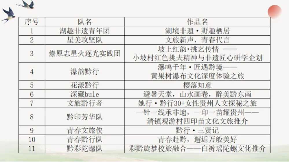 根据《关于举办贵安·清镇“职城杯”多彩贵州·青春创旅校旅结合风采大赛的通知》安排,大学生“文旅推介官”旅游推介大赛已完成线上专家评审。经评审专家组综合评议,以下11支队伍成功入围线下路演环节。