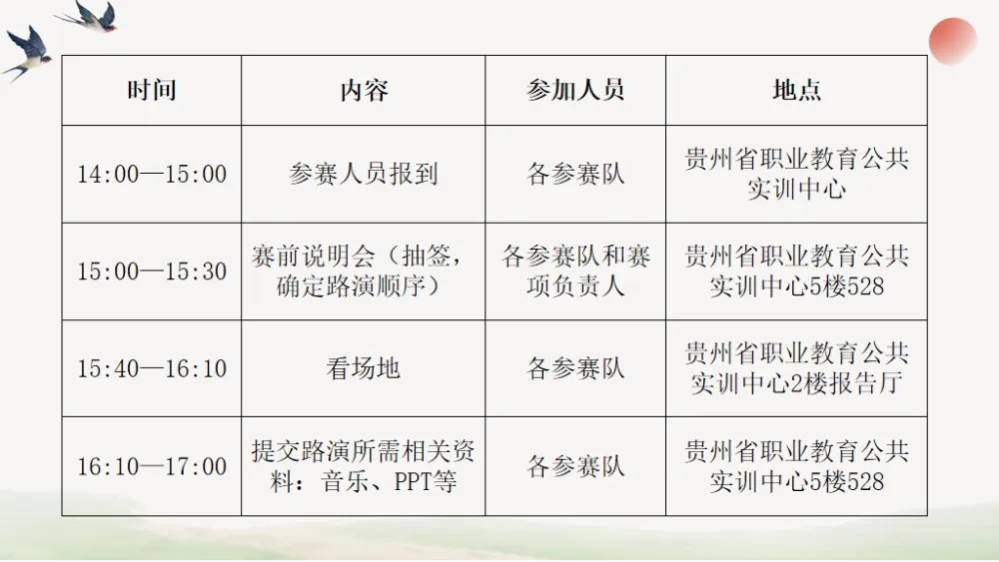 第二阶段:路演比赛(3月21日上午)时间:2026年3月21日8:20检录进场,9:00正式开始地点:贵州省职业教育公共实训中心2楼报告厅形式:每组12分钟创意推介(演讲、情景剧、脱口秀等)+ 评委提问