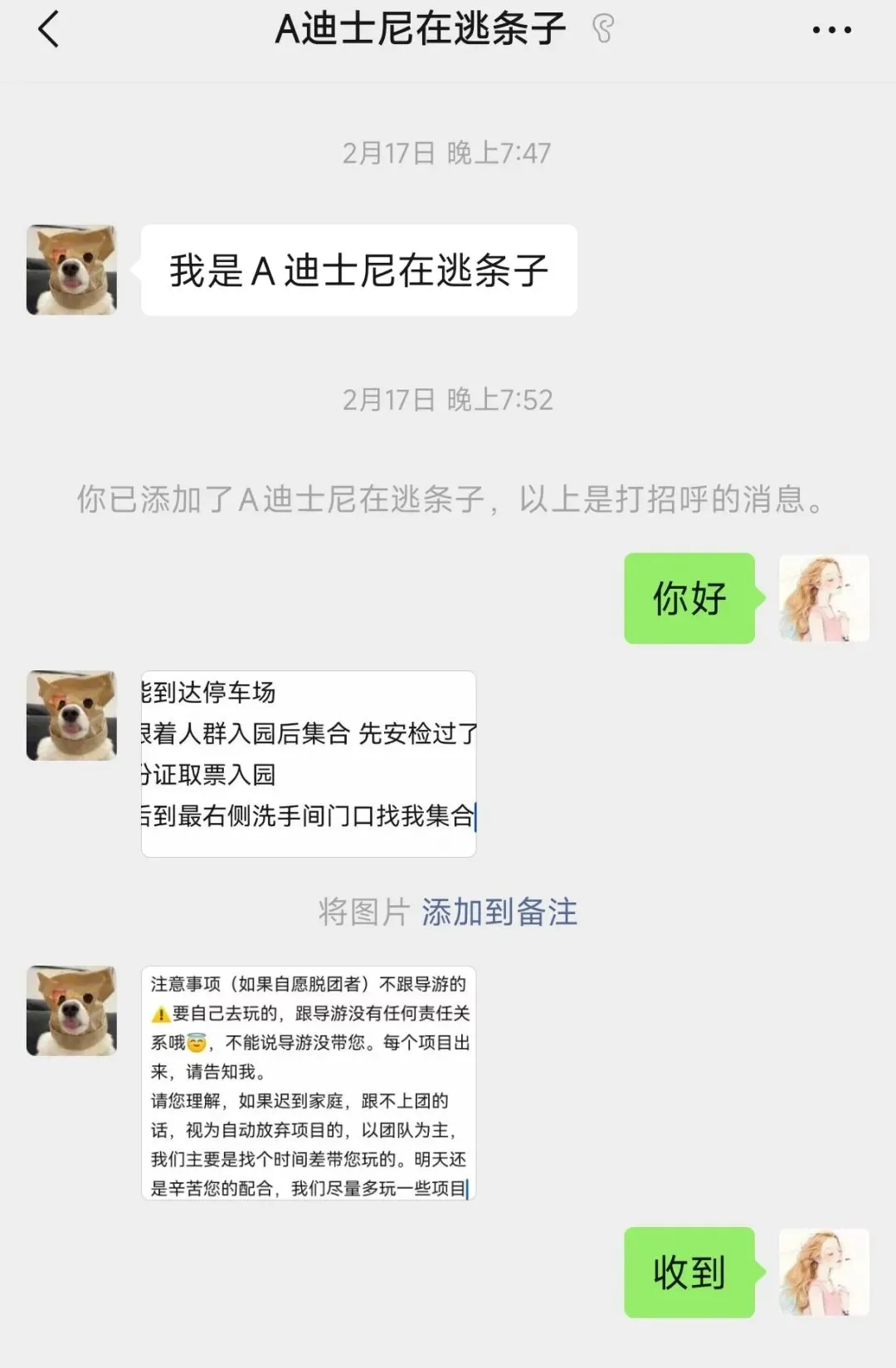 我们刚到酒店房间,就接到了迪士尼带玩管家的电话,加了微信,他把迪士尼集合地点和注意事项发给我。