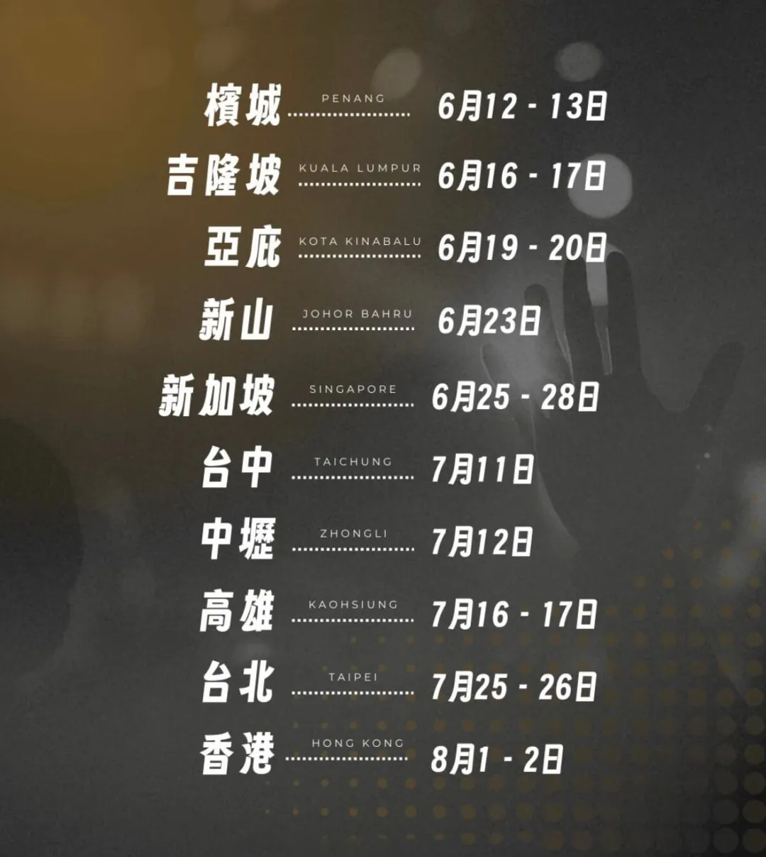 新加坡(6/25-26),台北(7/6-7),高雄(7/16-17)
