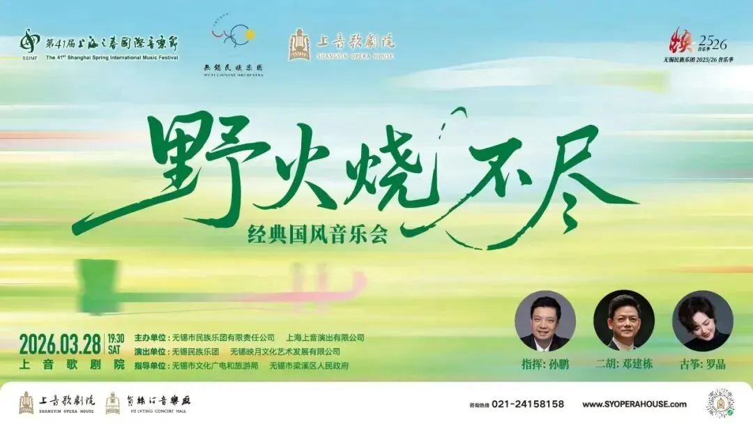 上音歌剧院“野火烧不尽——经典国风音乐会”即将启幕(3月28日 19:30,购票享8折优惠),民乐新声如野火逢春。