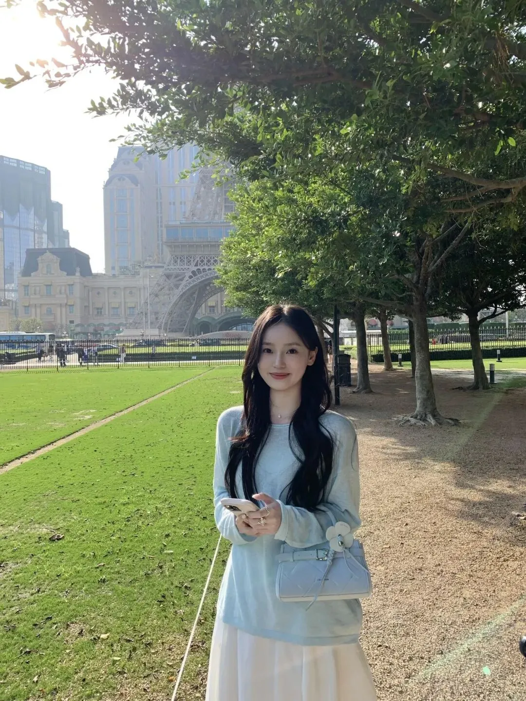 不用绷紧身体,放松靠过去就好。背景还能把草坪和巴黎铁塔都框进去,氛围感直接拉满。