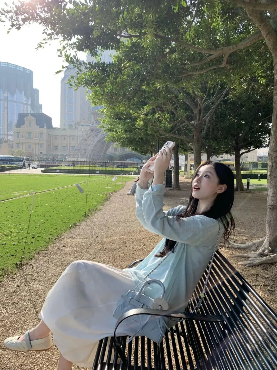 坐在长椅上,双手举手机对着上方,假装在拍远处的风景。