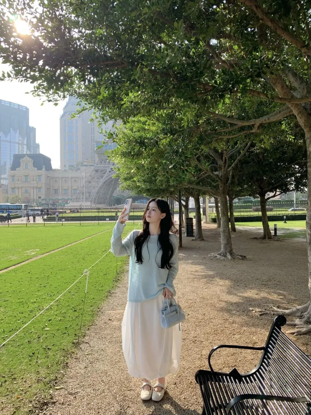 想拍全身照就这么站,一只手举手机假装对镜自拍,另一只手自然提着包包。