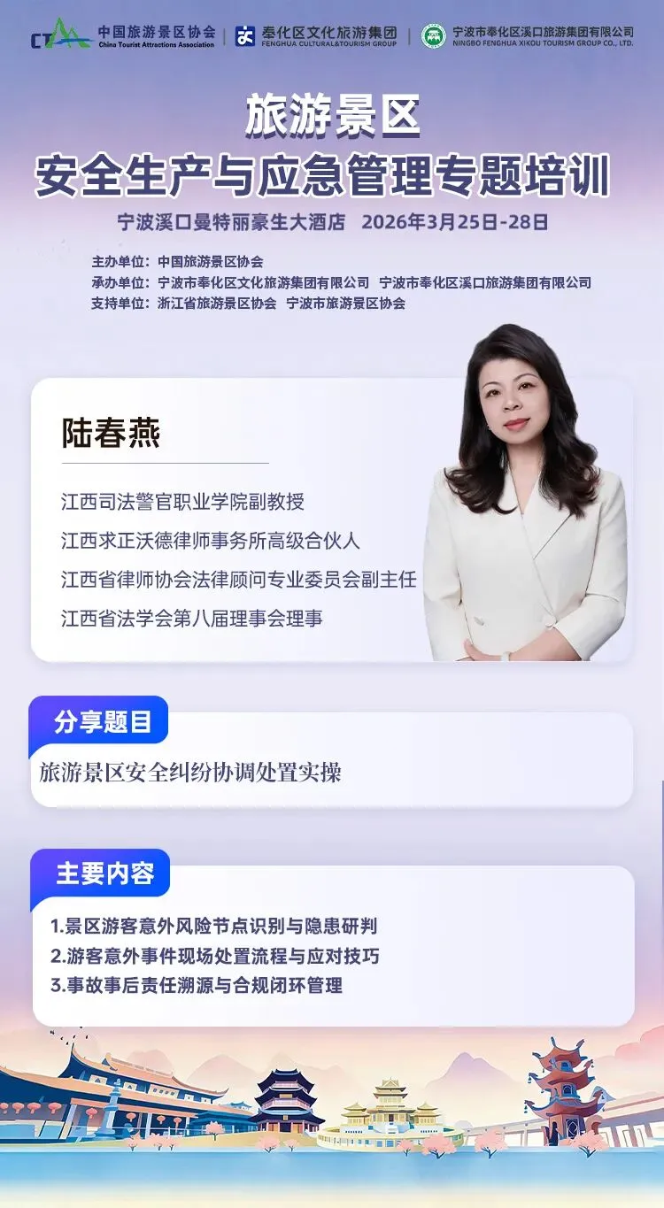深耕安全管理,方能行稳致远。当景区安全管理遇上实操难题,这场聚焦落地、贴合实际的专题培训,值得每一位景区安全负责人奔赴学习。与行业专家、同行伙伴齐聚宁波,解锁景区安全纠纷处置的实操方法论,让景区安全管理更专业、更高效、更合规。