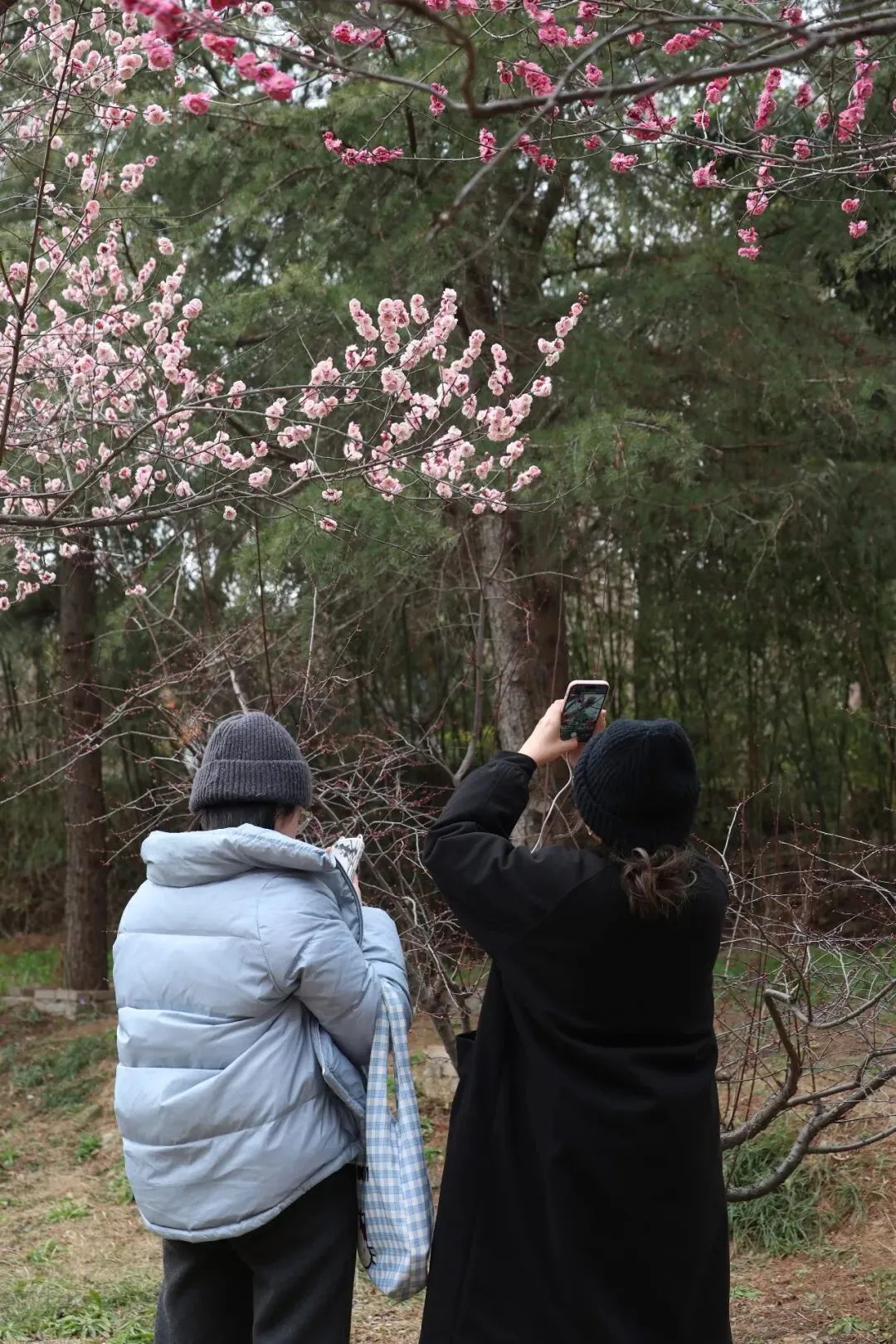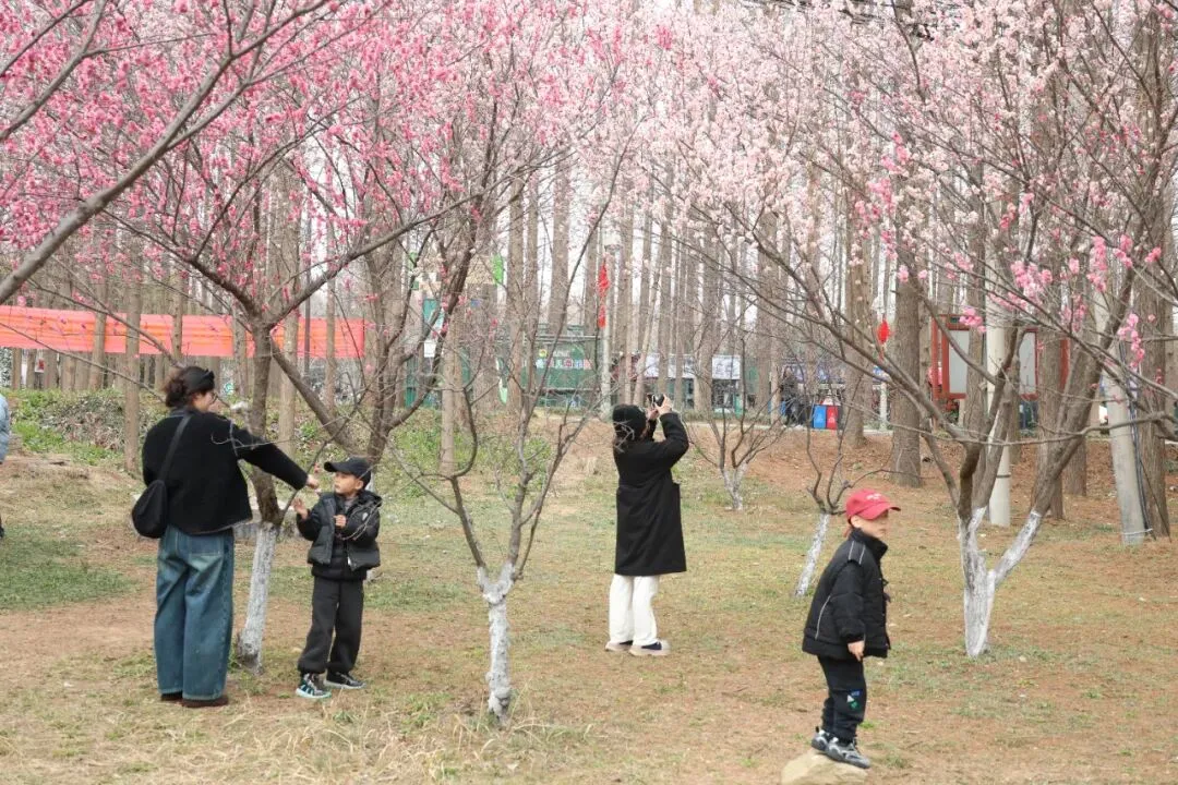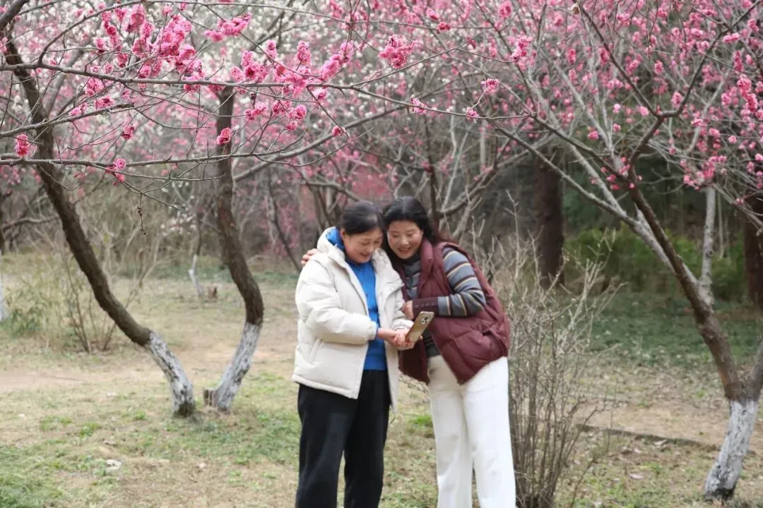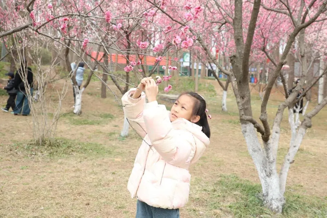这抹悄然绽放的粉色诗意,引得市民游客纷至沓来。花间小径上,随处可见驻足流连的身影,有人凑近枝头轻嗅梅香,感受春意;有人举着手机,或蹲或仰,反复调整角度,只为定格花开最美的瞬间。欢声笑语在林间流淌,镜头内外,皆是春光。