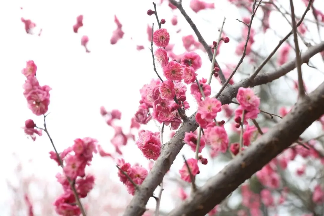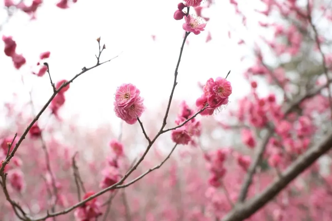放眼望去,粉白色、粉红色的梅花开得热烈烂漫,密密匝匝缀满枝头。微风拂过,花枝摇曳生姿,与笔直参天的水杉林相映成趣,构成一幅色彩清丽、层次分明的早春画卷。
