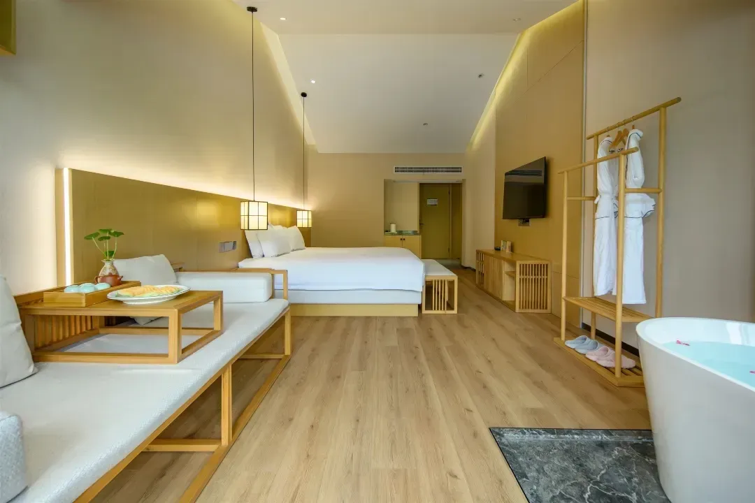 性价比非常出挑的当属览山观景房,清新且宽敞,面积45㎡,配置出挑:部分客房靠窗还摆放着一个景观浴缸。
