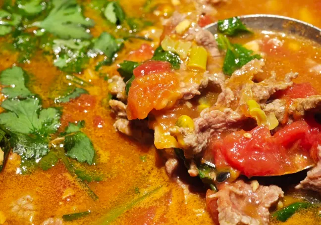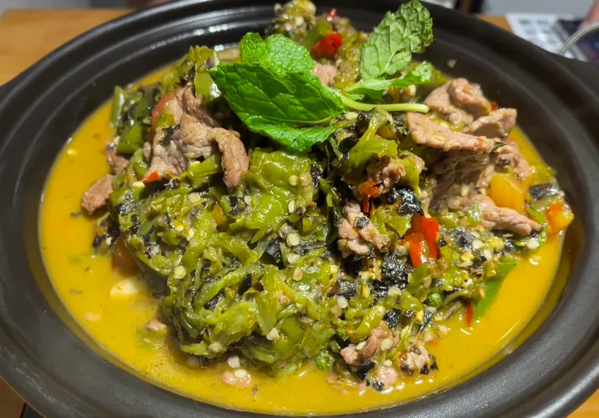 酸汤牛肉:镇远酸汤系列的灵魂硬菜!选用本地传统发酵的红酸汤(以野生毛辣果、红辣椒古法酿造),搭配纹理均匀的牛上脑或牛眼肉,肉片薄嫩入味,在酸汤中涮煮后吸饱酸辣精华。入口先是醇厚酸香,后带一丝鲜辣回甘,木姜子的独特香气萦绕舌尖,暖心又开胃。推荐苗伯妈酸汤、黔一刀,店家还会搭配辣椒面+鱼骨粉特制蘸料,层次感直接拉满,酸汤泡饭更是一绝!