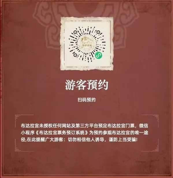 请提前7天登录“布达拉宫票务预订系统”或布达拉宫官方微信公众号预订参观。