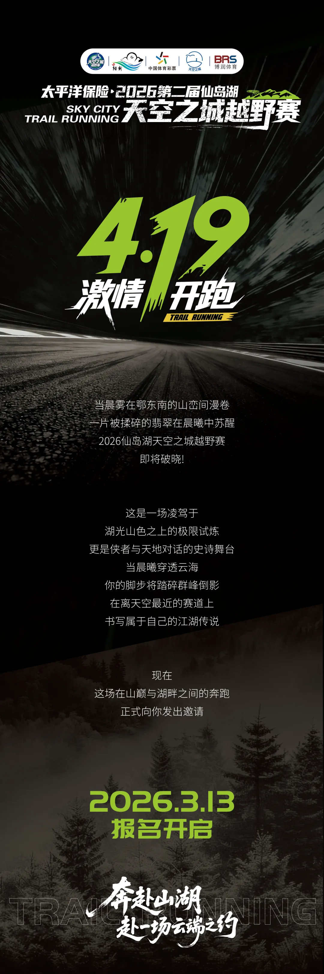 太平洋保险·2026仙岛湖·天空之城越野赛定于4月19日(周日)7:00在湖北省黄石市阳新县仙岛湖区域(含天空之城景区)开赛,起终点为天空之城石贵发广场,赛事规模3000人,设52KM(300人)、25KM(700人)、5KM(2000人)三个项目;3月13日15:30至2026年4月5日18:00开放报名,先报先得,额满即止!3月23日前报名享受早鸟价!