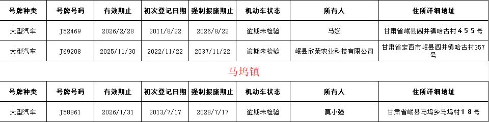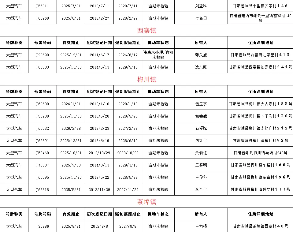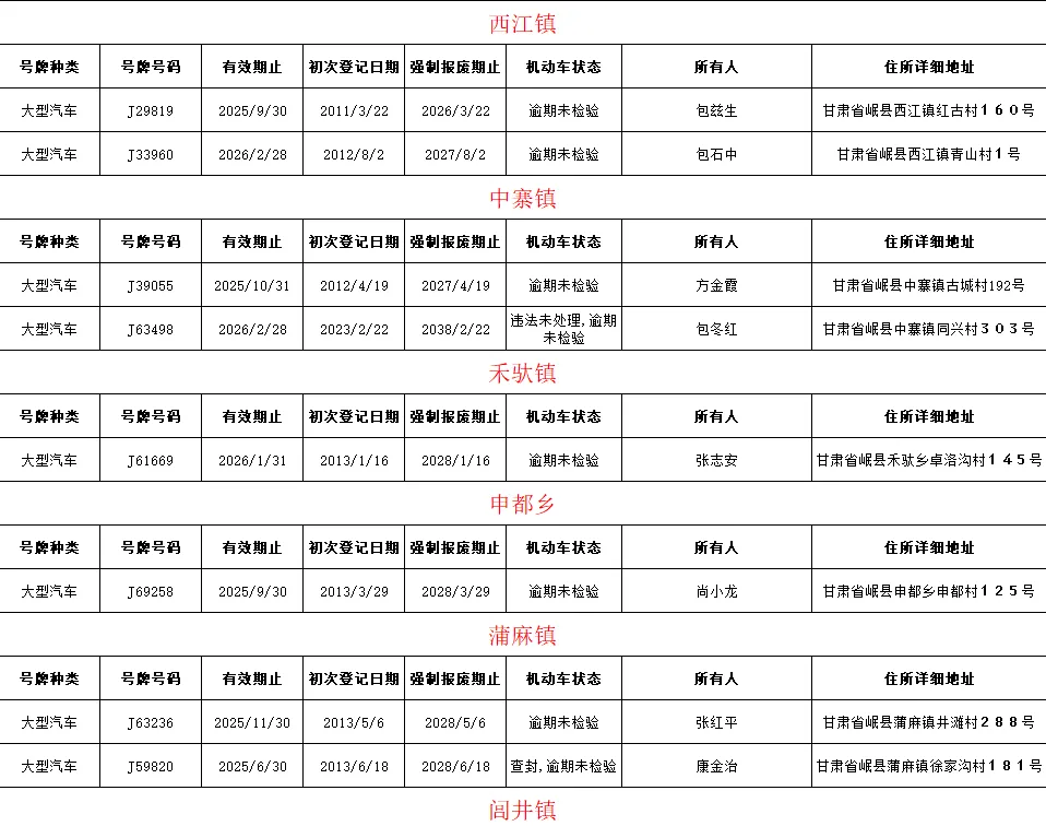 为切实消除道路安全隐患,有力保障交通安全,岷县公安局交通管理大队现对全县重型货车、挂车、旅游客车、公路客车临期或逾期未检验车辆进行曝光。请车辆所有人及所属企业尽快办理车辆违章处理和检验手续。在规定期限内未完成车辆检验的将录入缉查布控系统进行精准查缉。