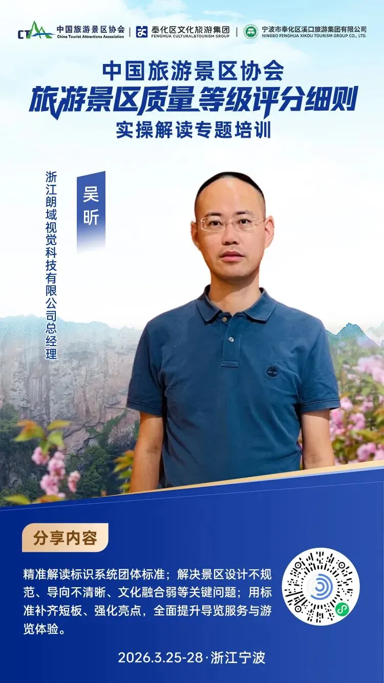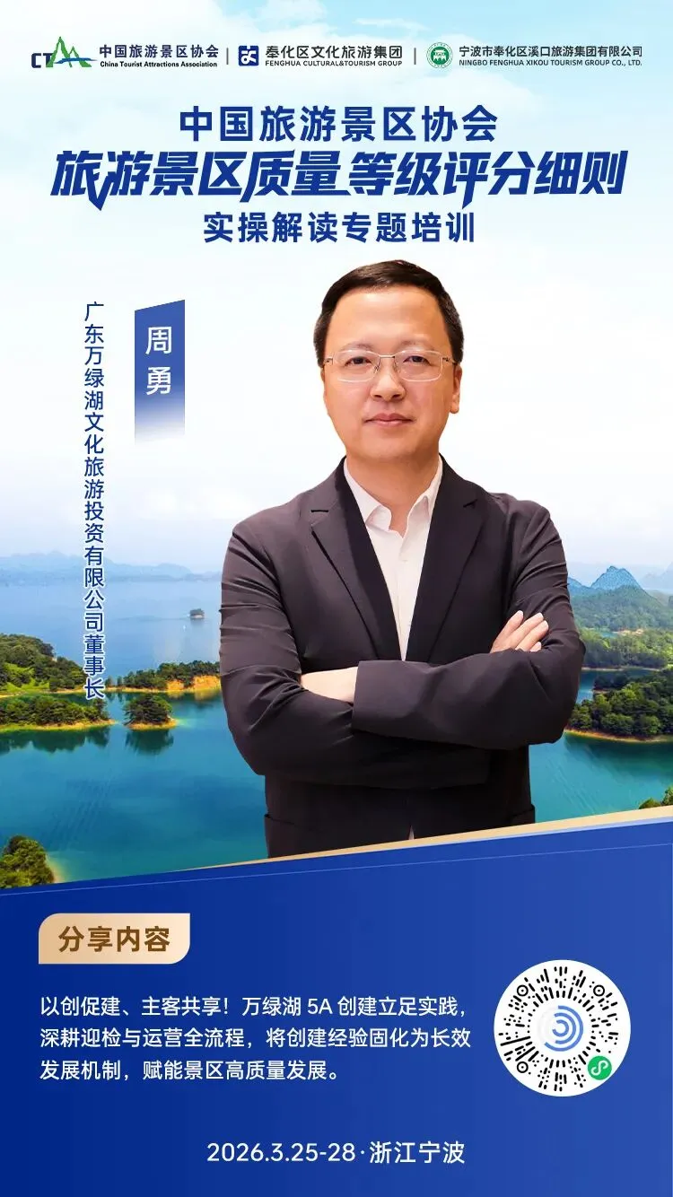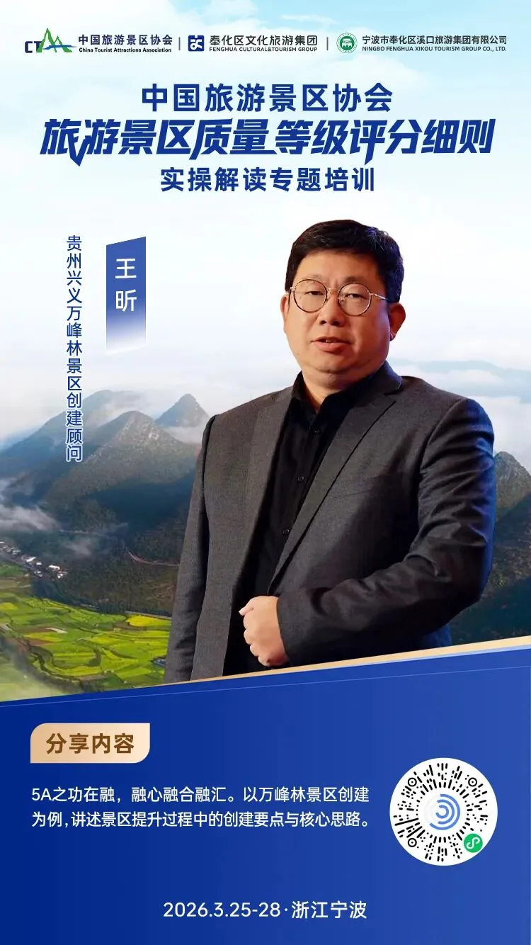 您现在的位置是:首页 > 国内旅游目的推荐 > 正文 国内旅游目的推荐 中国旅游景区协会《旅游景区质量等级评分细则》实操解读专题培训班分享嘉宾介绍 admin2026年03月14日 23:35:58国内旅游目的推荐2 中国旅游景区协会《旅游景区质量等级评分细则》实操解读专题培训班分享嘉宾介绍END编辑:蒋岚初审:田地、蒋娟娟审核:王玥、傅翔延伸内容【行业研究】陈献春:以“小而美”场景创新抢占AI时代代理交互新赛道培育新动能的路径探讨关于缴纳2026年度中国旅游景区协会会员会费工作的通知双班同开:《旅游景区质量等级评分细则》实操解读、景区安全生产与应急管理培训班将于3月25日-28日在浙江宁波同期开班一图读懂|中国旅游景区协会2026年工作要点发布关于举办“中国旅游景区小而美演艺场景焕新与融媒体创新发展大会”的通知👇关注我们,获取更多文旅资讯与出行攻略👇🌟星标“中国旅游景区协会”,及时获取最新推文🌟 转载请说明来源于"旅荐网",部分内容转载自网络,如有侵权请联系qlwl@foxmail.com删除 本文地址:https://www.15386.cn/post/145573.html 上一篇 海鸥去巴黎—旅游 下一篇 非遗活态传承:古窑景区祭祀窑神 点燃窑火 相关文章 报名电话4.10 号旅游班列返乡9日游 新规解读丨《旅游投诉处理办法》3月15日施行,游客维权“加速”,社合规“加压” 【错峰旅游】999元住清远英德倚峦风吕温泉度假酒店园景600㎡两房一厅+自助早餐+泳池,4A景区+私家泡池+公共温泉! 广东省5A及4A级旅游景区 曾是“最具性价比的旅游城市”,低调却是真值得,每一处都让人心动!! 国内游攻略 | 不赴国外!西沙这片治愈蓝海,凭身份证就能解锁~ 上海市5A及4A级旅游景区 旅游需要导游,人生需要导师 一眼入神都!洛阳4大必打卡景点,把千年风华装进旅途 把婚姻登记处开到热点景区也是很用心啦! 发表评论 取消回复 评论列表 这篇文章还没有收到评论,赶紧来抢沙发吧~