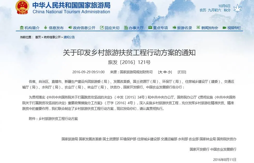 各省区市旅游部门牵头,结合实际尽快制定推进落实行动方案的具体举措,确保各项任务落到实处,各有关部门要按照职责分工抓紧制定配套政策,营造良好环境。扶贫工程,充分发挥乡村旅游在精准扶贫、精准脱贫中的重要作用,我们联合制定了乡村旅游扶贫工程行动方案,现印发给你们,请认真贯彻执行。