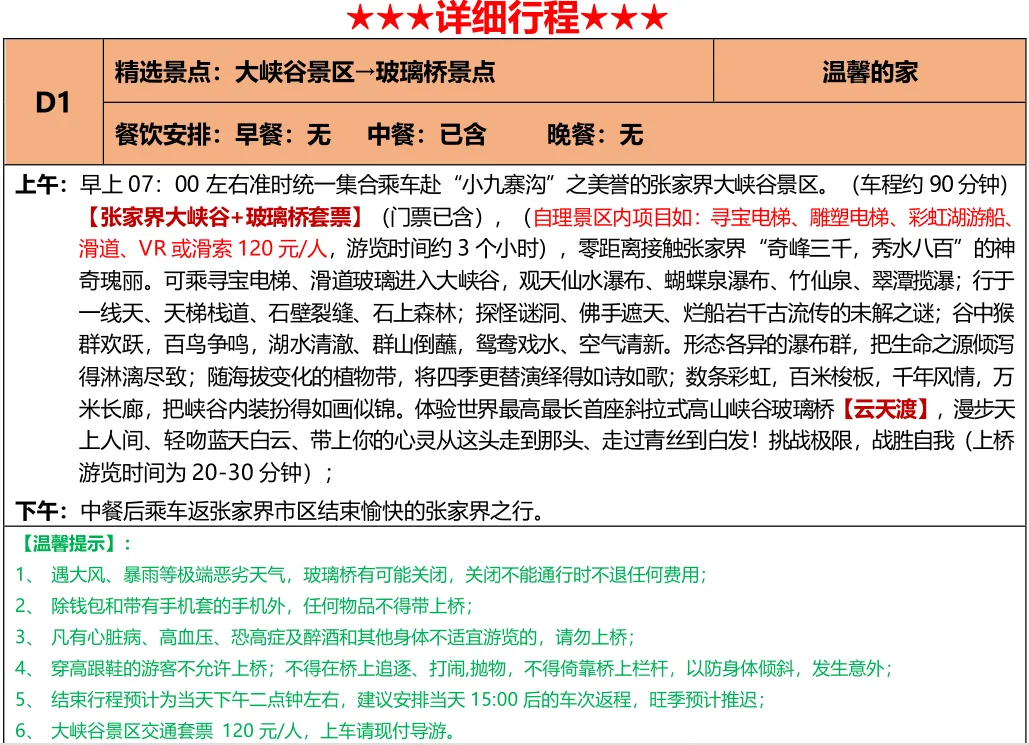 💛费用包含:张家界市区酒店接送+1天旅游车费+1个中餐+景区大门票+导游服务+保险