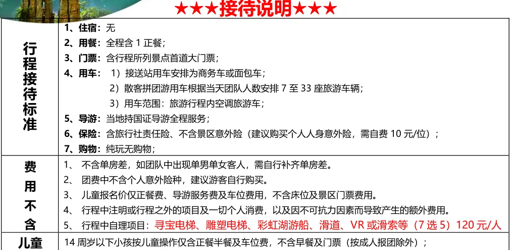 备注:成人需自理景区小交通120元【寻宝电梯、雕塑电梯、彩虹湖游船、滑道、VR或滑索等(7选5)120元/人】