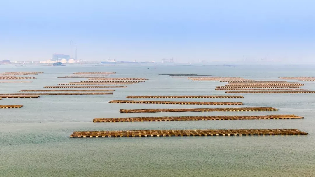 岛的远处,海面上吊养大蚝的一片片浮排,和插养在滩涂上的一块块蚝田,也是一幅壮观的景象。