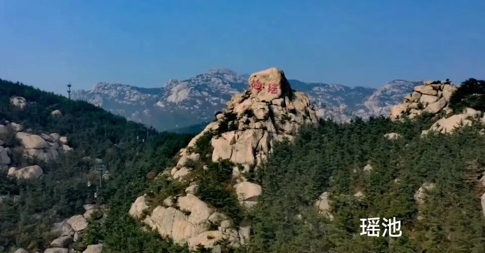“瑶池”二字,每字高7.3米,宽6.2米,笔划宽达1.5米,深近0.5米,二字共占近90平方米,于1980年10月竣工,青岛市杜宗甫书。