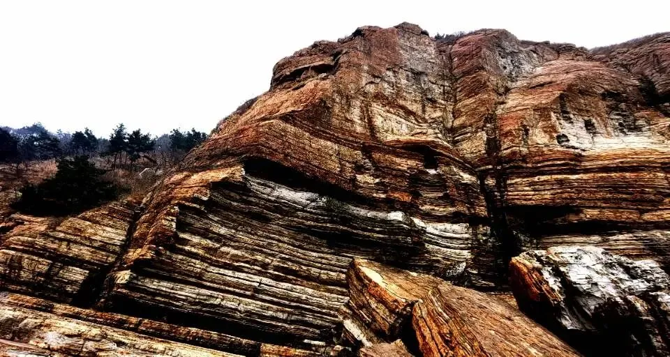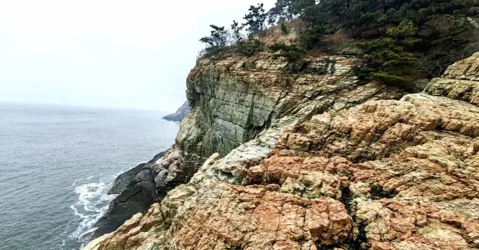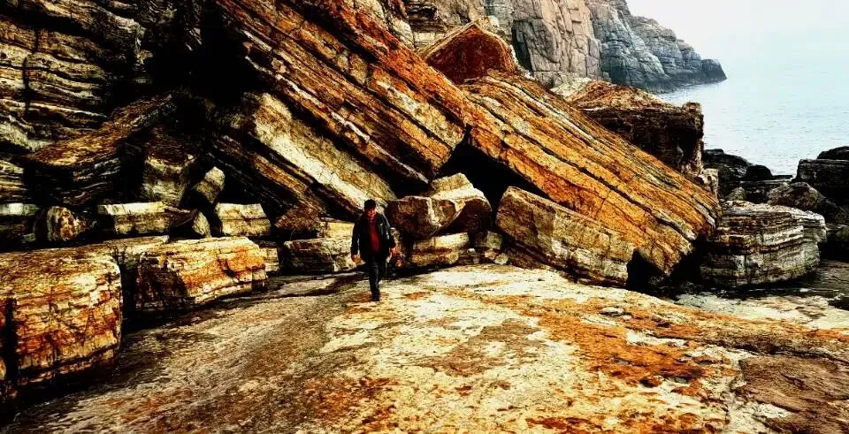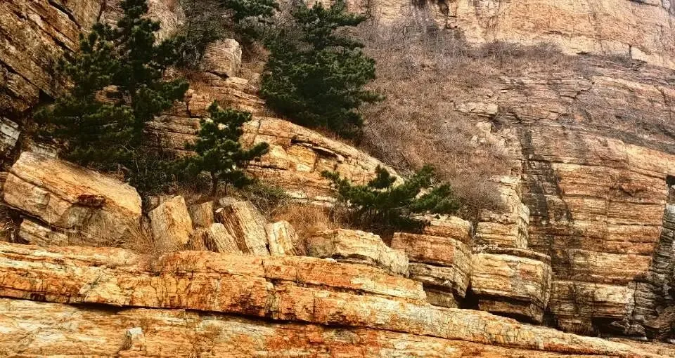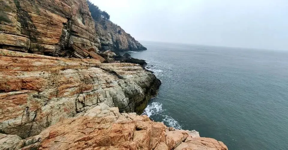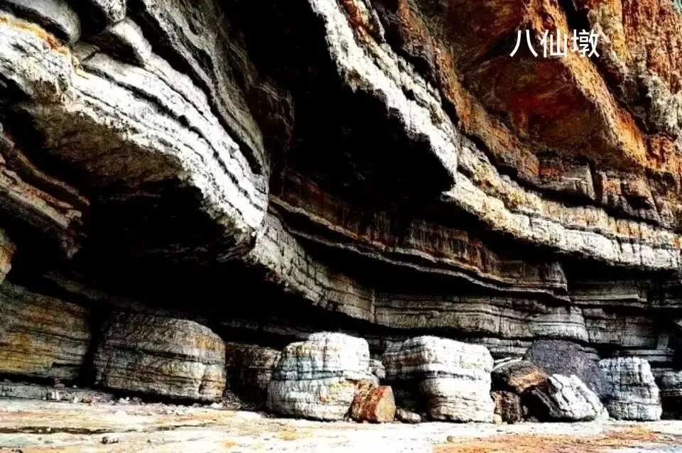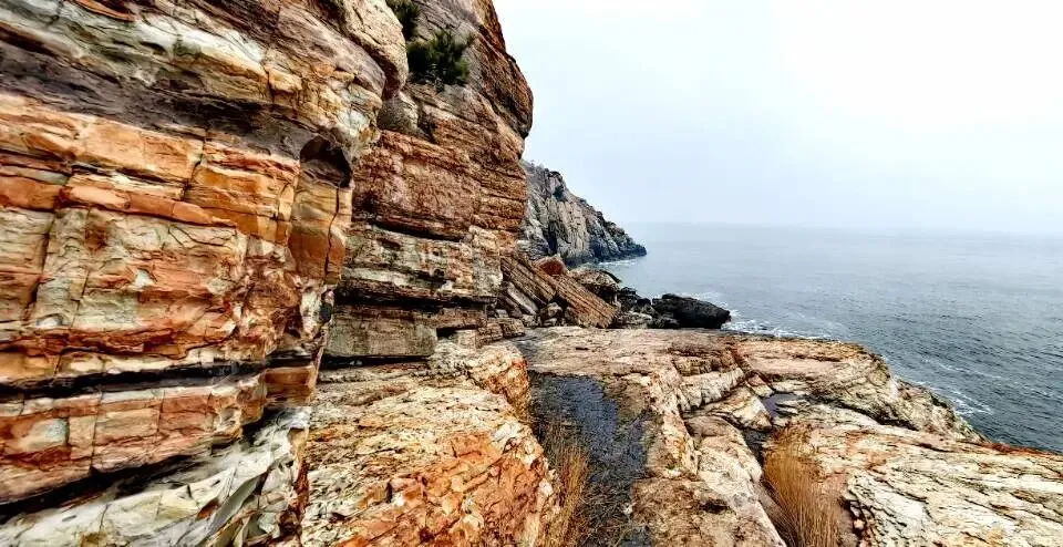 其丽在其“色”。八仙墩是彩色的,这在崂山的绝壁也绝无仅有。其石壁分青、黑、翠、紫、黄五色,层层叠叠,斑驳如绣。