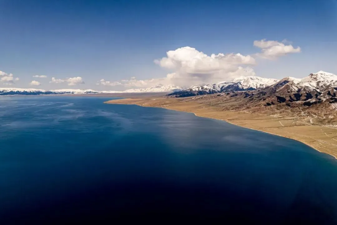 湖水因矿物质折射呈现蓝绿渐变色,四周雪山环绕,风景纯净而辽阔。