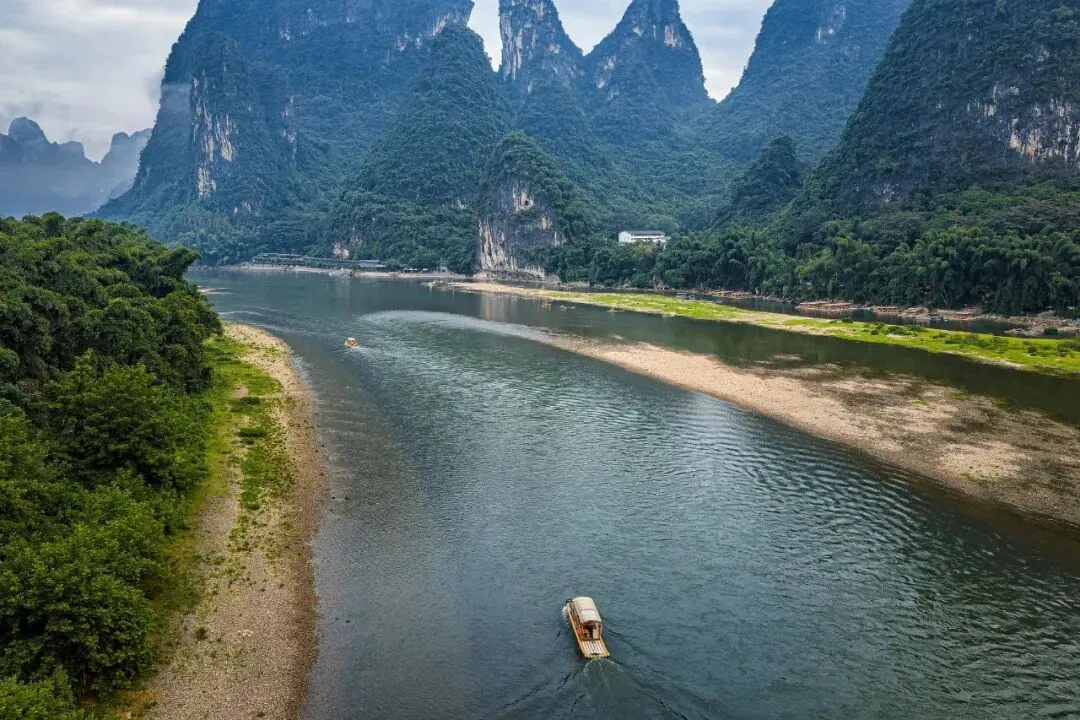 竹筏顺江而下,宛如行走在水墨画中。