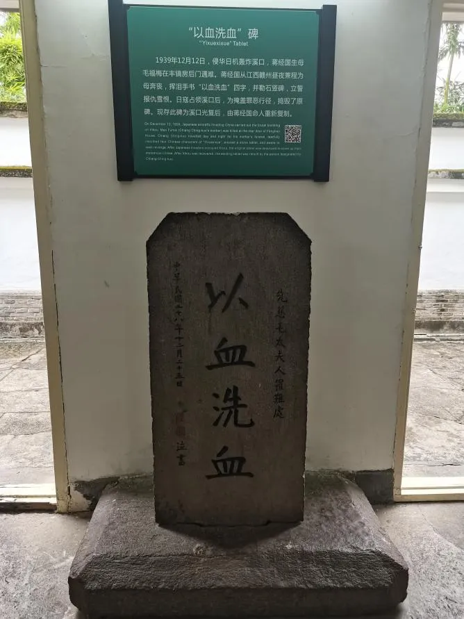小洋房目前展示的内容主要包括蒋经国的生平介绍以及与其相关的历史文物。记录了他在不同岁月里的风采与魅力。小洋房还陈列了一块“以血洗血”的石碑。1939年12月12日,侵华日军飞机轰炸溪口,蒋经国的生母毛福梅在丰镐房门后遇难。蒋经国闻讯后从赣州昼夜兼程赶回为母奔丧,悲愤中挥泪手书“以血洗血”四字,并勒石竖碑,立誓报仇雪恨。日寇占领溪口后,为掩盖罪恶行径,捣毁了原碑,现存此碑为溪口光复后,由蒋经国命人重新复制。碑文:“先慈毛夫人罹难处,‘以血洗血,中华民国26年12月25日,经国泣书。”从碑文可以看出蒋经国先生对母亲罹难的悲痛,对日寇的极端痛恨。