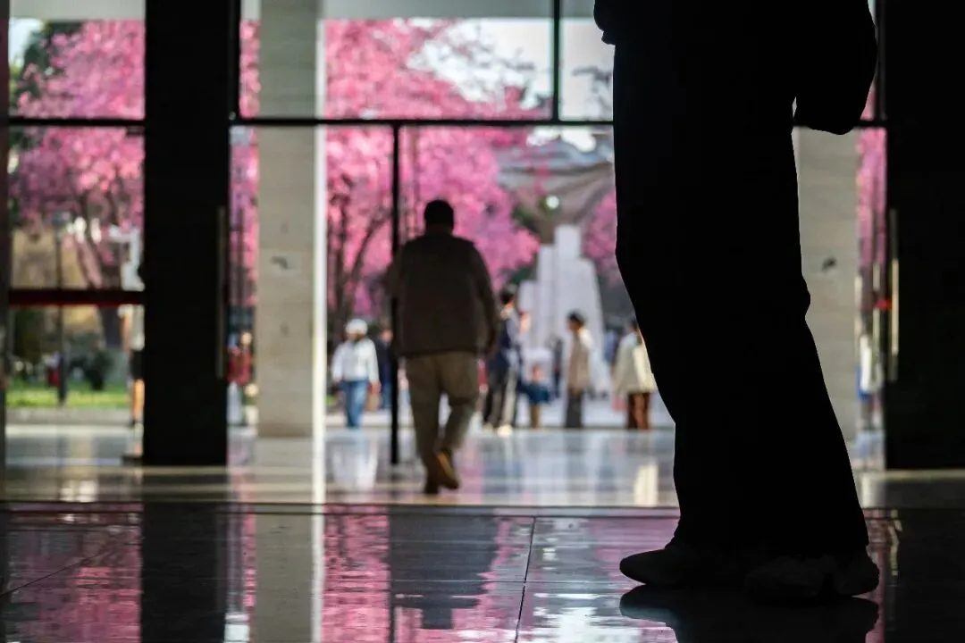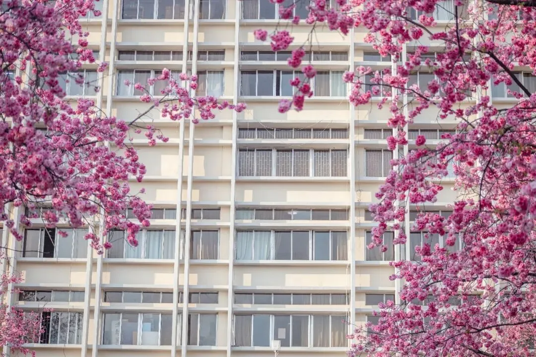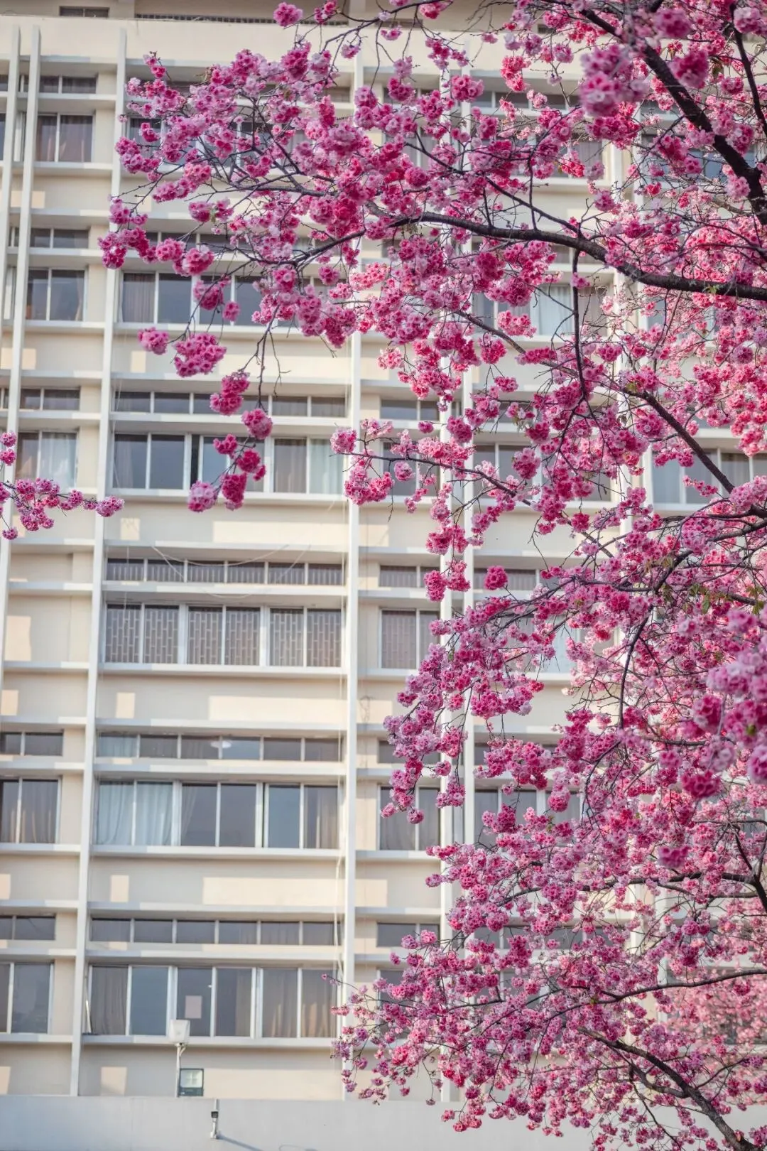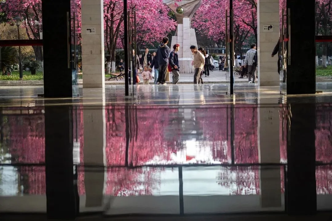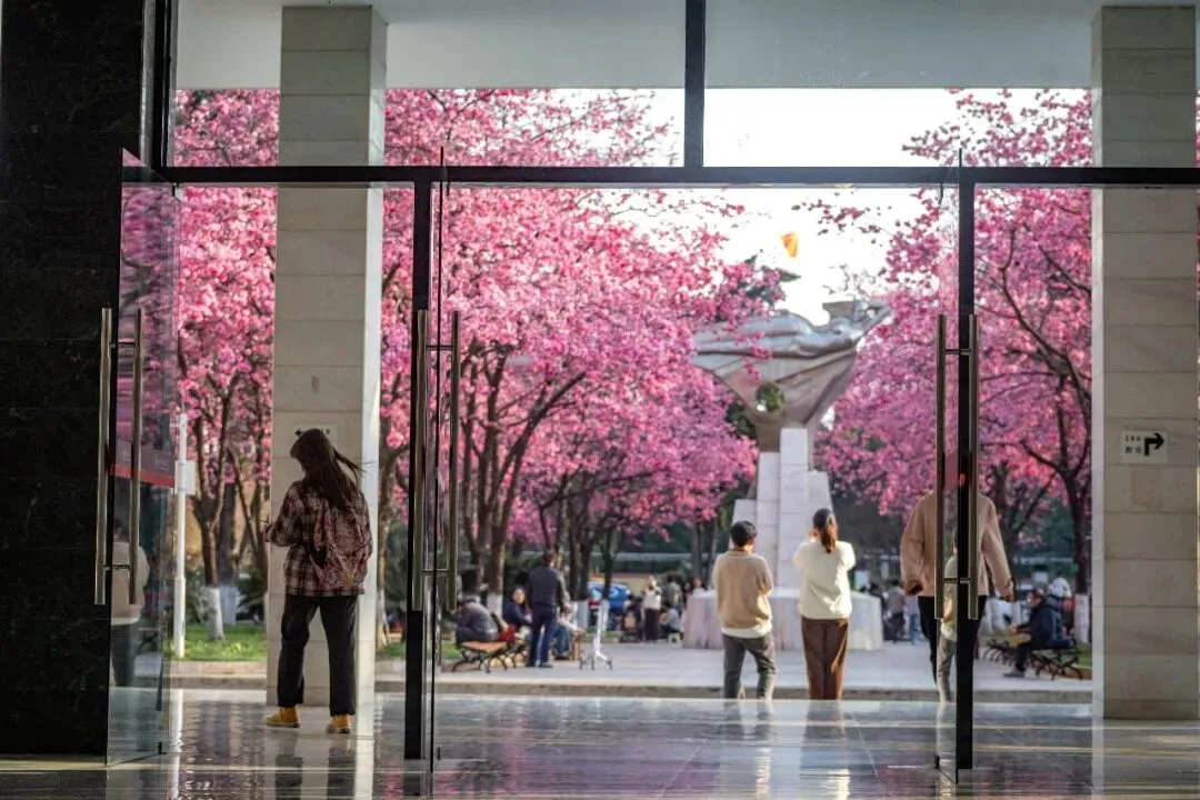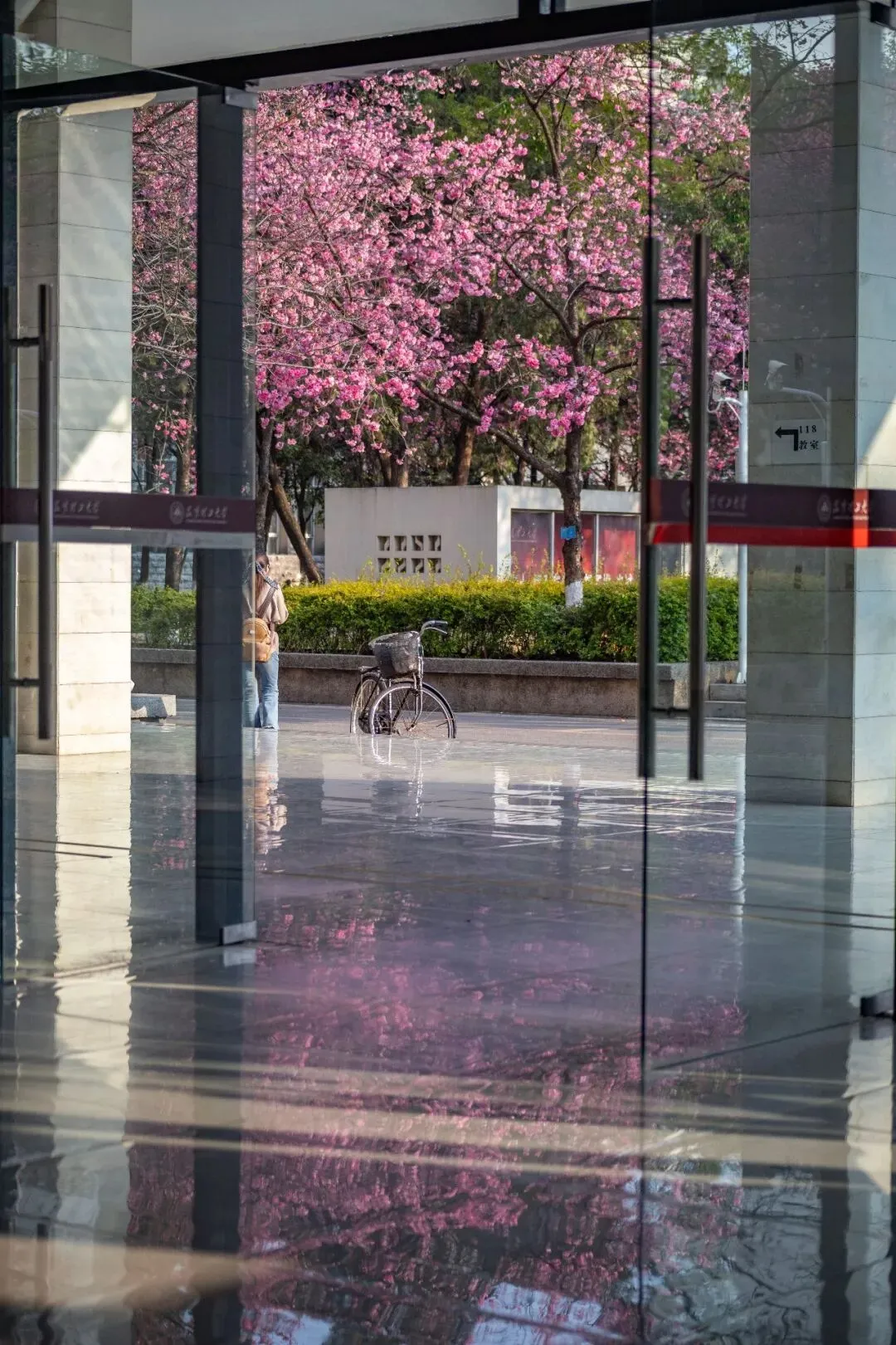 这是最有故事感的一个角度。透过玻璃门框望出去,满树粉樱包裹着雕塑,室内的倒影与室外的春光叠在一起,明暗交错、樱粉温柔、建筑线条干净利落,像把一整个「春日故事」装进了画框。路过的行人、散落的光影,都成了画面里最温柔的点缀,谁能想到,教学楼的一扇门,能把春日美成电影截图 。