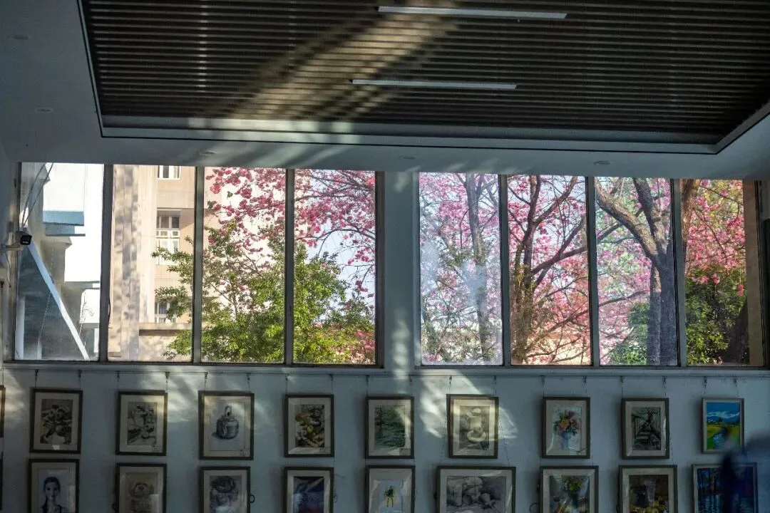 窗外是盛放的樱花,墙面上挂着学生的画作,阳光把樱枝的影子轻轻投在画框上。室内的文艺气息,撞上室外的烂漫春光,像是把春天裱进了画廊。连走廊都变成了春天的展厅,安静又治愈。