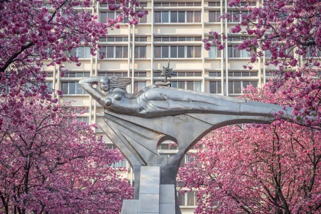 4.樱花树中央的雕塑:谁能拒绝被粉樱包围的雕塑?教学楼前,雕塑的利落线条撞上满树柔艳的粉樱,连行人的身影都成了春日里的温柔注脚 ,这哪里是校园景,明明是青春与春天撞了个满怀。站在这儿,仿佛能听见风裹着花瓣,把校园里的旧时光都吹得温柔起来。