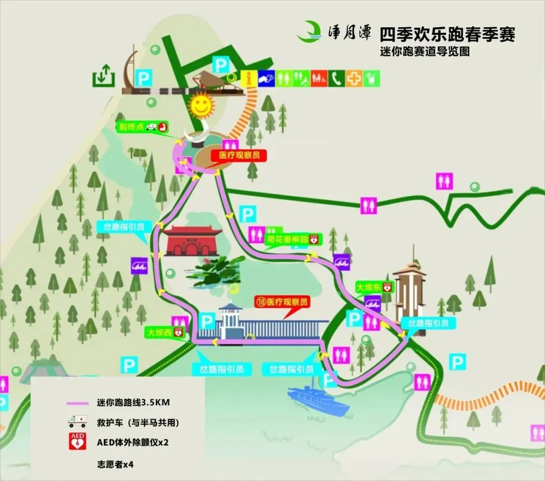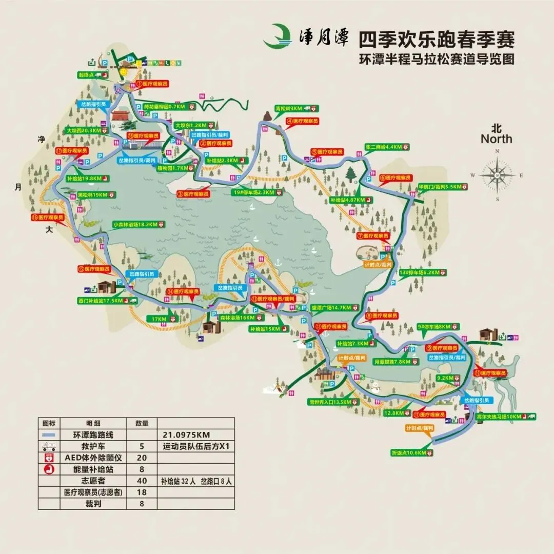 (一)环潭跑 女神广场(起点) → 北普陀寺 → 三星门 → 黑松林 → 景区西门 → 水上栈道 → 森林浴场 → 瓦萨桥 → 中国瓦萨博物馆 → 雪世界 → 高尔夫练习场折返点 → 月潭揽胜 → 华航门 → 灵草芳洲 → 青松岭 → 森林植物园 → 荷花垂柳园 → 女神广场(终点) (二)欢乐跑 女神广场(起点)→ 北普陀寺 → 大坝西(左转) → 大坝东(右转)→ 月亮湾(左转) → 碧松净月塔楼 → 女神广场(终点)