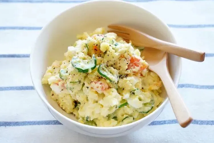 这是道日式马铃薯色拉。因为是使用比欧式美乃滋味道清淡的日式美乃滋,所以口感味道可能会与其他国家的马铃薯色拉有些许差异。马铃薯色拉中通常还会加入玉米、小黄瓜、红萝卜以及洋葱等食材。