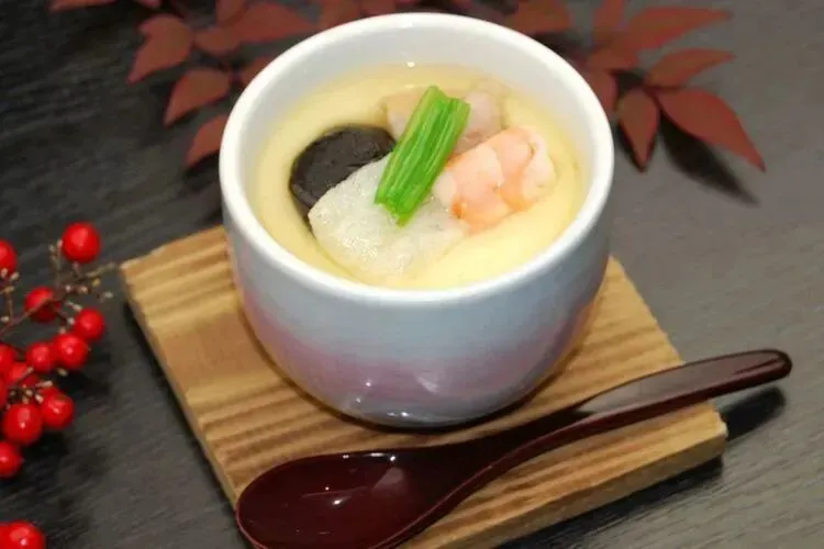 茶碗蒸,通常会在蛋液中加入许多配料,例如:鸡肉、鲔鱼、虾子、鱼板和银杏...等,然后再以高温蒸煮,是传统日式餐厅都有提供的餐点。