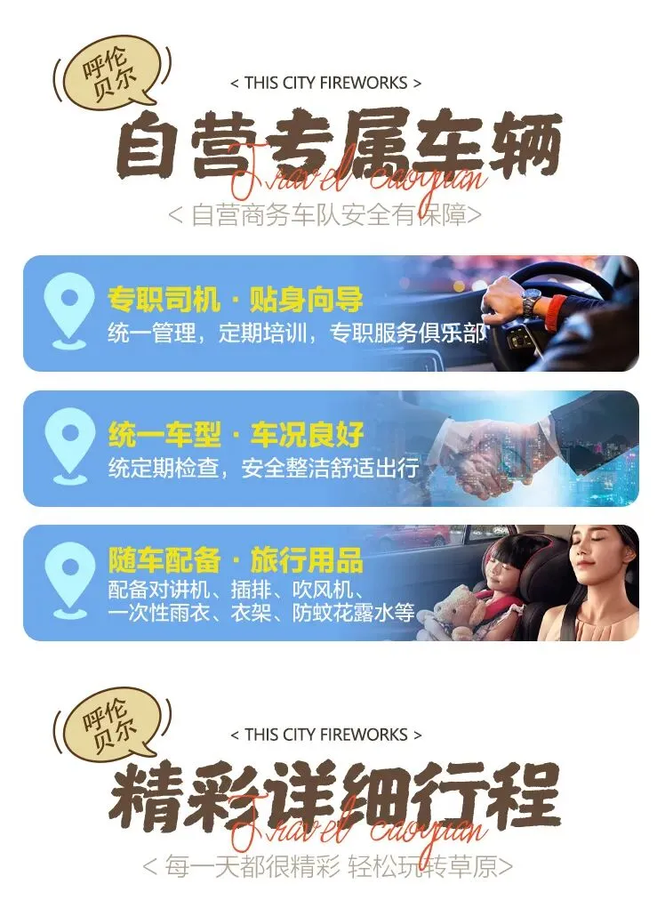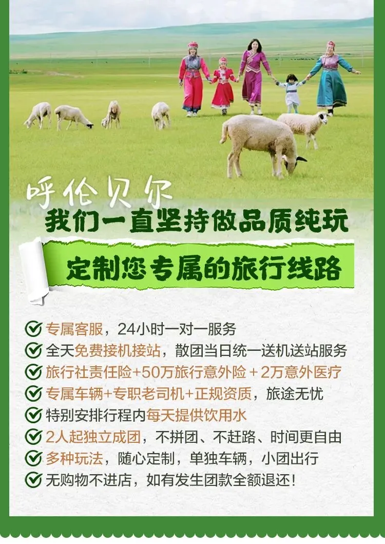 精选具有多年草原带队经验的当地优质司机兼职领队,为人风趣幽默,驾驶技术娴熟,对呼伦贝尔当地风土人情,自然景观非常了解。如需要配备专职领队需额外支出领队费用,本团费不包含领队费,导游服务费。
