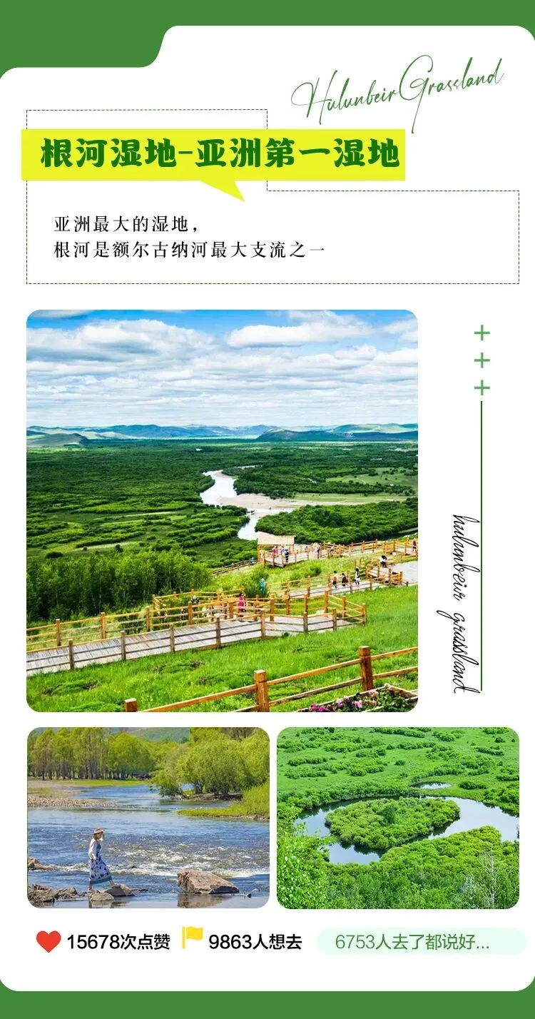 我们前往市郊的亚洲第一湿地【根河湿地】车程约10分钟,漫步湿地顶端,美丽的城市风光、宛若仙境的自然生态、蜿蜒曲折的河流流淌在湿地中央,天然景色与人文景观交相辉映,是久居城市的人们心灵停靠休憩的港湾。我们一路走走停停,体会这湿地与草原相接的美景
