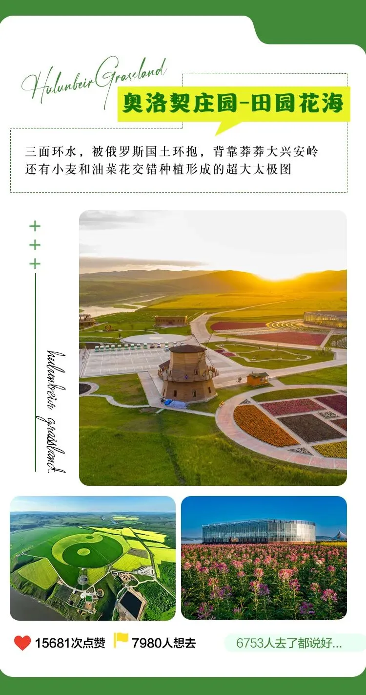来到额尔古纳河三面环绕的【奥洛契庄园】,乘坐网红观光拖拉机游览用小麦和油菜花构成的太极图,野生勺药坡,百合谷,彩虹菜地,心形玫瑰园,情人岛等田园风光,还有趣味丛生的各类活动,童趣沙场,植物迷宫等各类游玩运动场所。不管是什么年龄都能找到属于自己的一份乐土,景区内还有咖啡厅,让您在尽兴之余享受舒服的下午茶