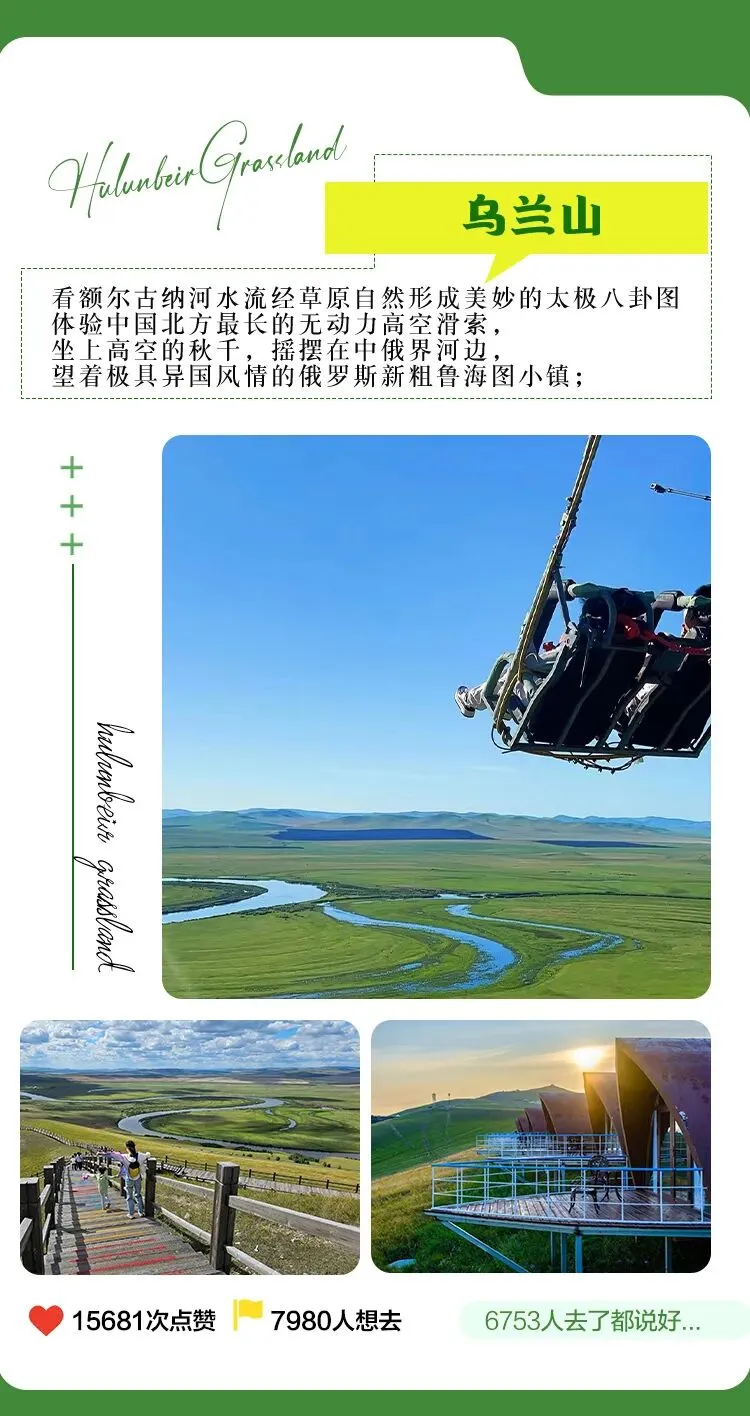 途径【乌兰山】这里是网红打卡地,最有名气的项目是高空秋千,坐上高空的秋千,摇摆在中俄界河边,望着极具异国风情的俄罗斯新粗鲁海图小镇,看额尔古纳河水流经草原自然形成美妙的【太极八卦图】,由于夏季景区排队的人流比较多,排队的时间比较长,所以未把此项列入活动之中,如果特别想体验这个项目的队友可以跟领队和同行客人协调好时间,在大家都同意的情况下可以自费体验游玩哦。