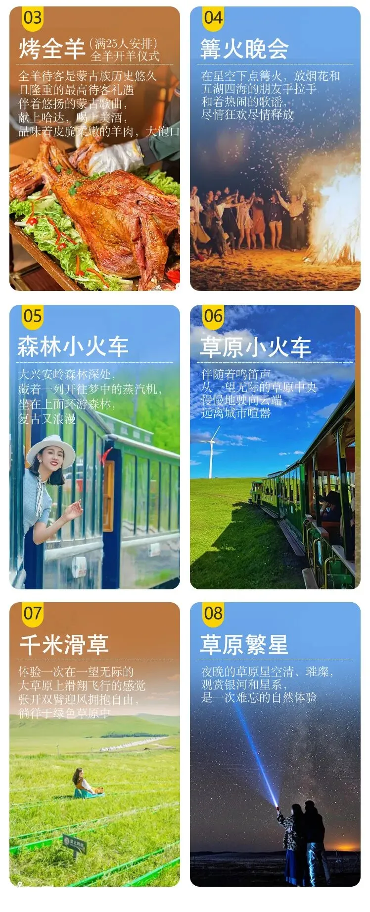 室韦口岸-水墨-边境卡线-乌兰山(太极图)-骑马-访牧户-乘网红小火车千滑草-湿地落日-蒙古包营地-烤全羊-篝火晚会