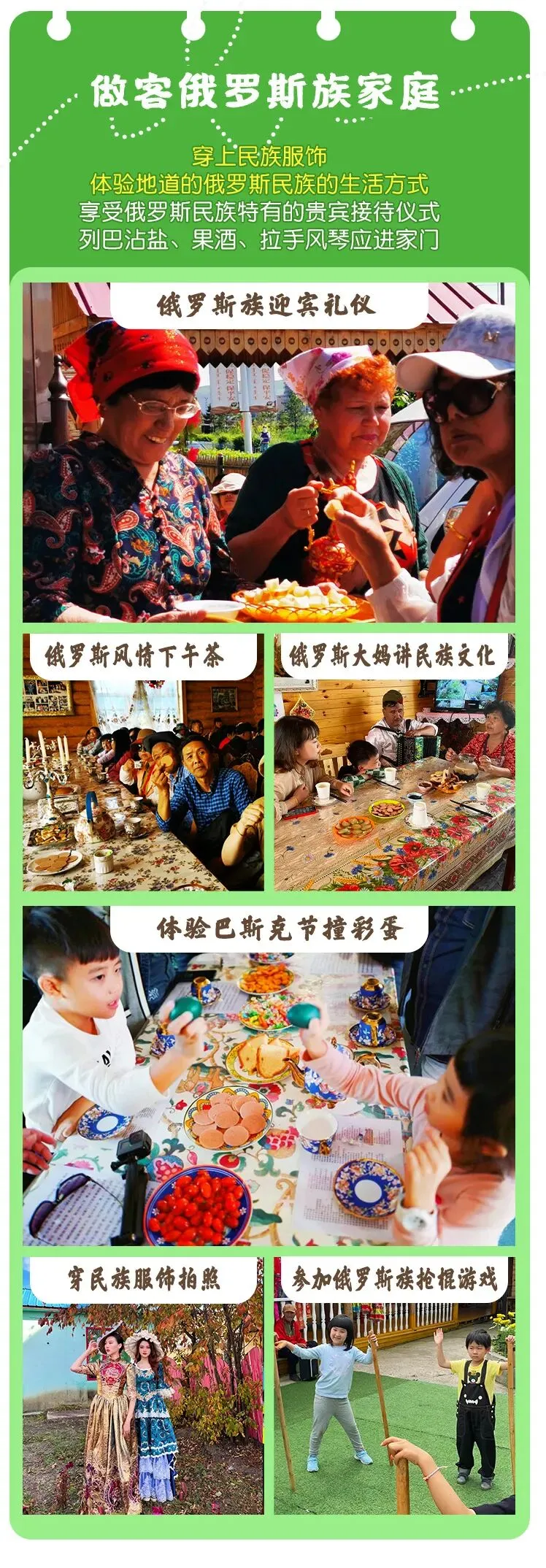 我们一同走进额尔古纳俄罗斯族家庭,车程约10分钟,刚下车就会发现俄罗斯族大妈们已经热情地等在门外,有的端着列巴,有的端着果酒,还有的拉着手风琴为你接风表示欢迎,仪式感满满,列巴蘸盐可是俄罗斯迎宾的最高礼仪啦!在这里我们可以真实地体验到他们的生活,品尝俄罗斯大列巴,听大妈讲她们的民族文化和有趣的生活小故事,听俄罗斯歌曲演奏,撞彩蛋,伴随欢快地音乐加入俄罗斯族特色抢棍游戏,还可以穿上俄罗斯民族服饰拍照留念。