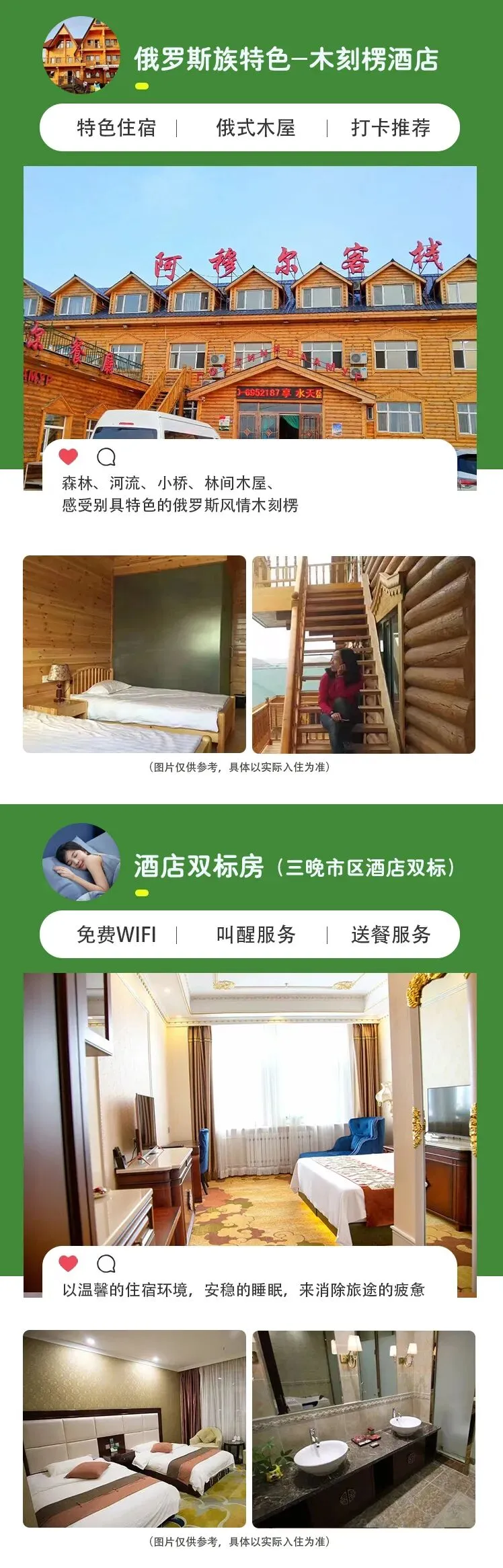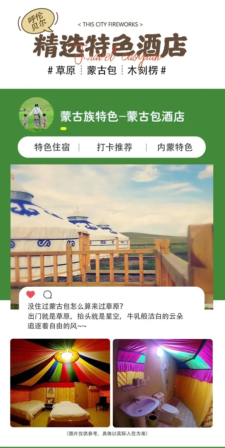 6、蒙古包及木刻楞(为独立卫浴标间)住宿不提供洗漱用品、吹风机等,多数酒店不提供饮用水,请提前自备,感谢理解