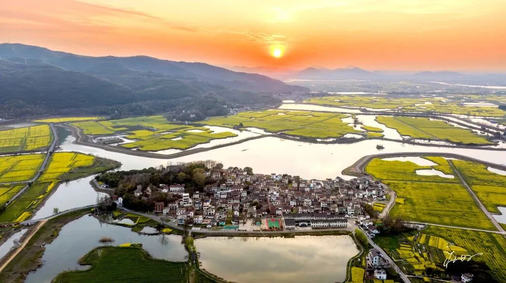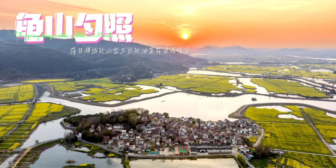 航拍省级美丽乡村龟山村,夕阳西垂,余晖漫洒。落日将远处山峦与近处油菜花染成暖金。水面泛着柔波,与霞光相映成辉。