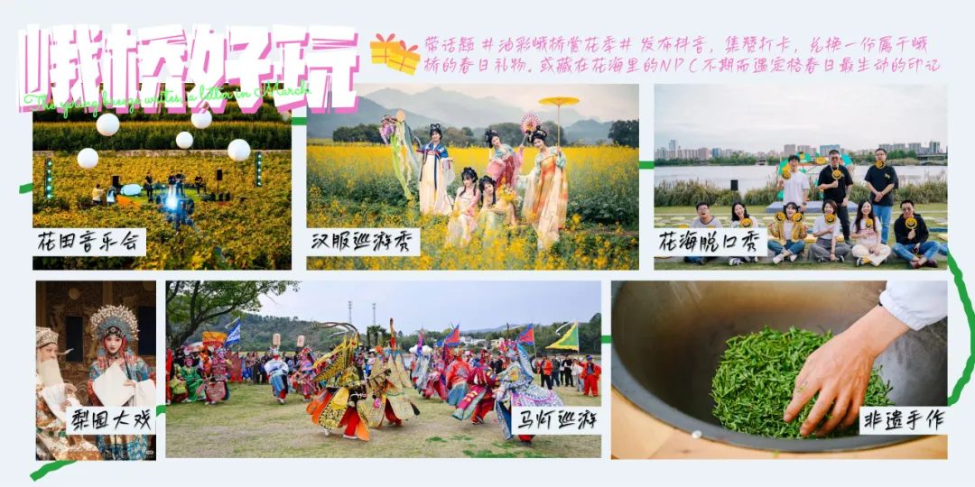 您也可以拿起手机,带话题 #油彩峨桥赏花季# 发布抖音,集赞打卡,兑换一份属于峨桥的春日礼物。或者,和我们藏在花海里的NPC不期而遇,留下一串串惊喜的脚印,定格春日最生动的印记。