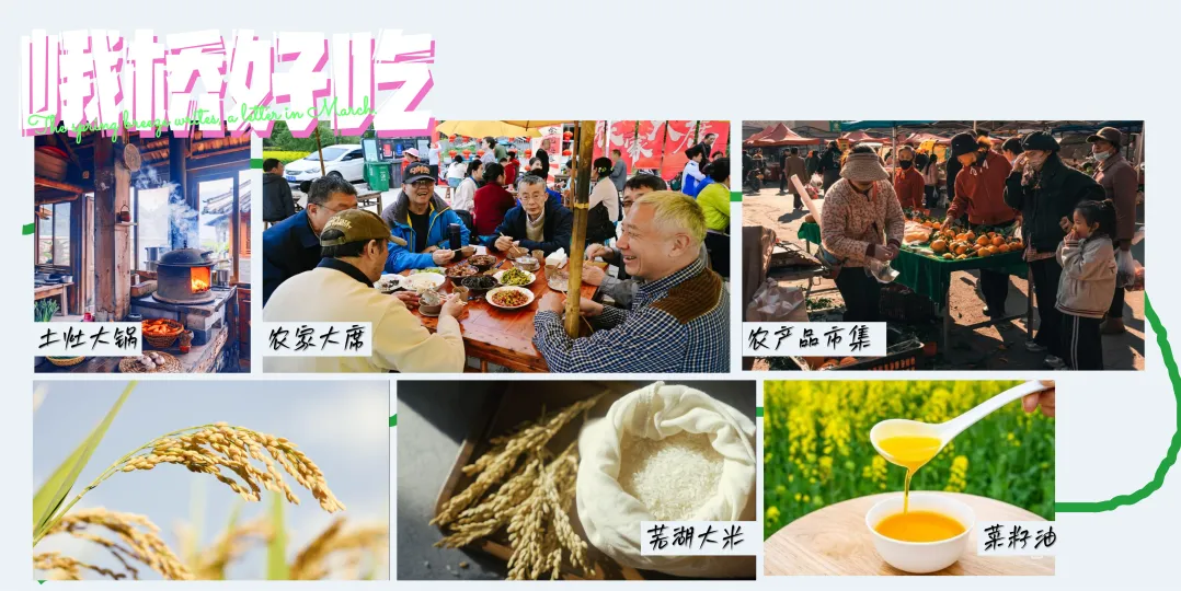 在花海深处,升起土灶大锅,烹一桌热气腾腾的农家大席,每一口,都是春天田野的味道。再去农产品市集逛一逛,把刚刚榨出的菜籽油,颗粒饱满的芜湖大米,这些带着阳光和土地温度的礼物,带回家,与最爱的人分享。