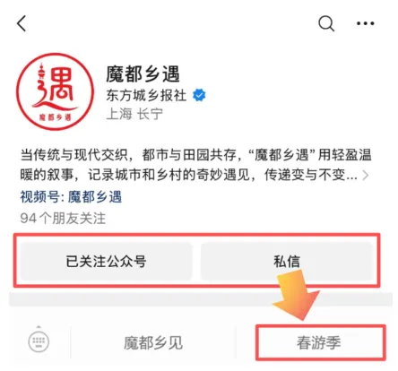 ①关注公众号“魔都乡遇”进入“私信”页,选择主菜单栏“春游季”选项