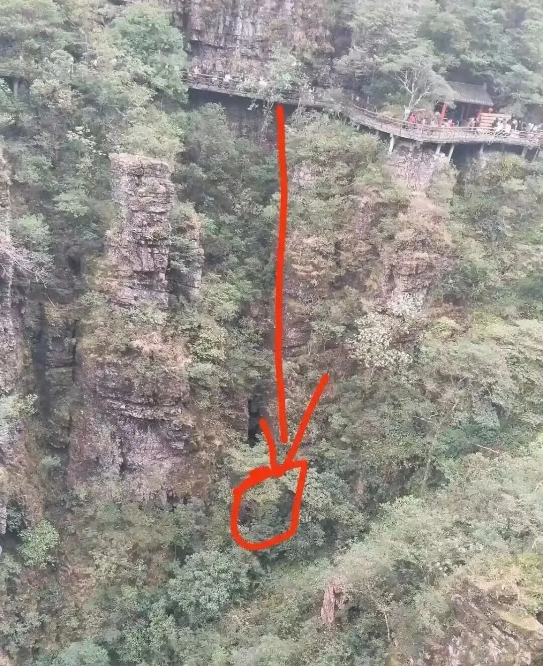 ▲栈道与山体间存在空隙(红圈处)。