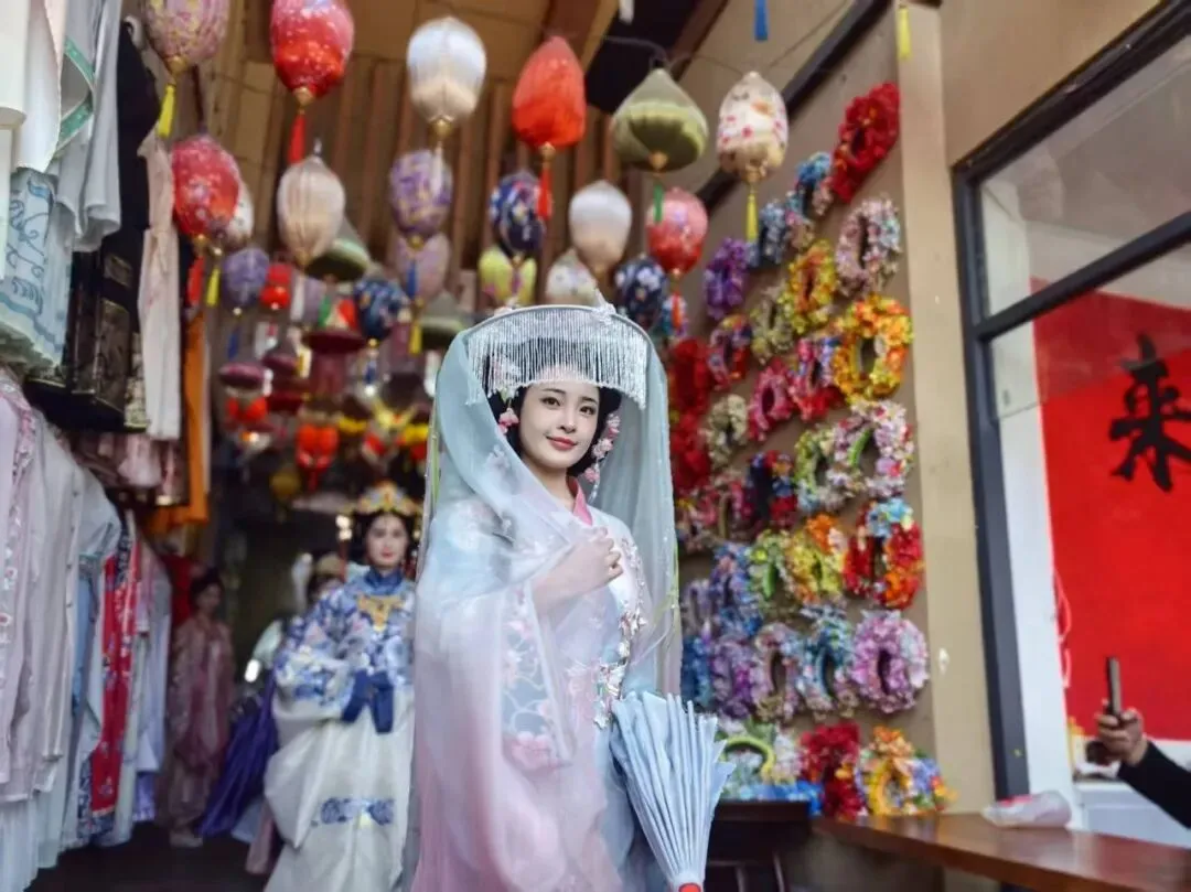 服务配套同步提档升级,景区组建800人规模的汉服租赁、簪花造型、美妆妆造、跟拍录制直营团队,联合街区商户打造日接待能力达2000人的核心消费场景,打通妆造、簪花、拍摄全流程环节,实现“来了即簪、簪好即拍、拍即出片”的便捷服务,让游客零门槛感受簪花乐趣。