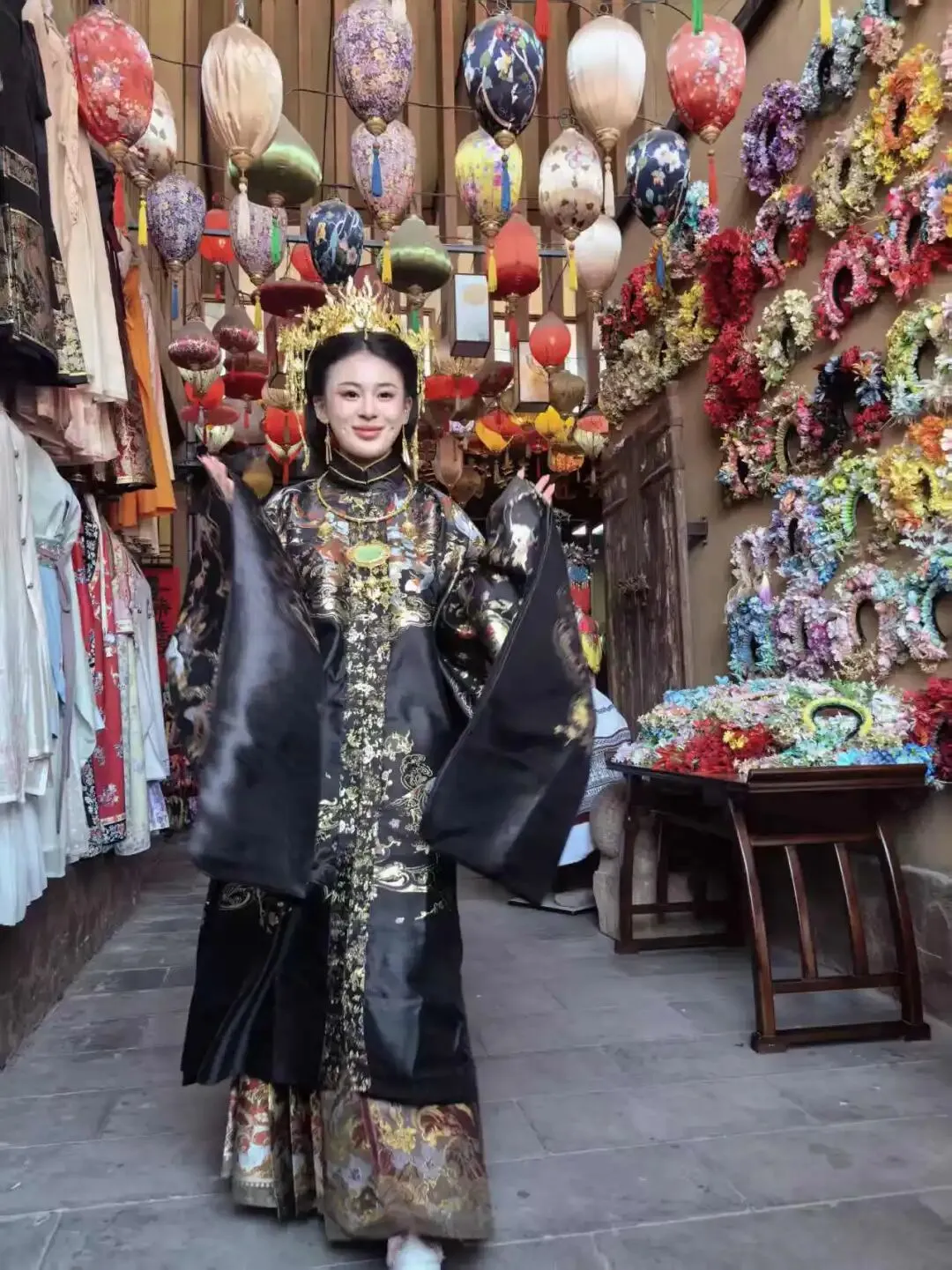 活动重磅打造“明制贵女”核心主题,成为本届最大亮点。15位学生花模头戴精致䯼髻、金簪银饰错落点缀,身着立领琵琶袖衫袄,外罩织金比甲或霞帔,下身搭配重工马面裙,妆容温婉雅致、仪态端庄大方,一颦一笑尽显大明盛世风华,瞬间成为街区里的亮眼风景线。