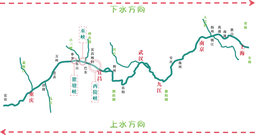 下水从重庆顺流至宜昌、武汉等地,上水从宜昌等地逆流至重庆,通常比下水多一天时间。按照行程长短,可分为以下几类: